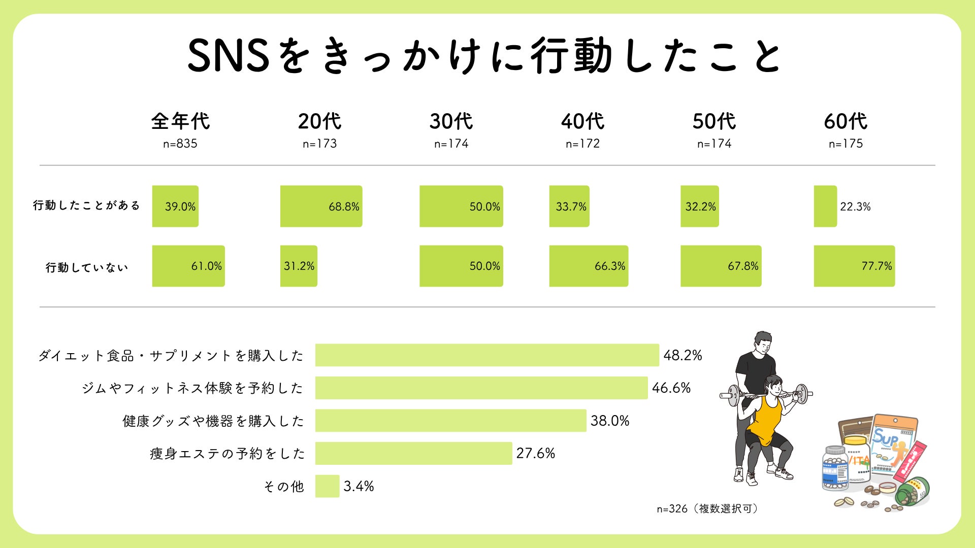 しかし、SNSをきっかけに実際にジム体験の予約やサプリメントの購入など、行動に移したのは約4割にとどまりました。