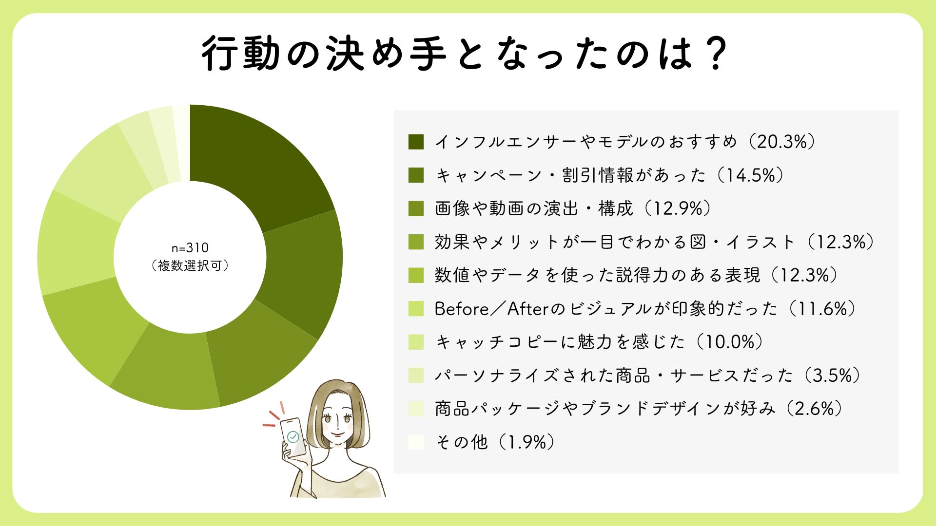 また、実際に行動した人に「決め手となった情報」を尋ねたところ、最も多かったのは「インフルエンサーやモデルのおすすめ」(20.3%)。