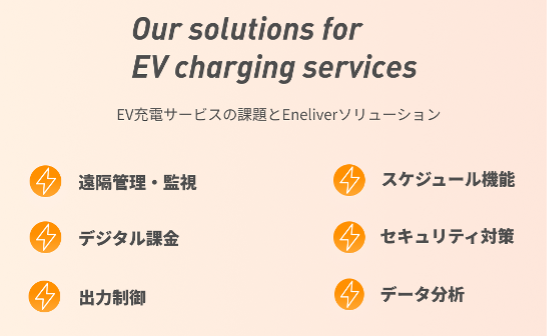 Eneliverは、これからも、既存の顧客基盤や多数の施設を保有する企業様に対して、充電システムの提供・開発・運用、マルチベンダー充電器の調達、設置工事、保守、補助金支援、カスタマーサポートなど、各企業のニーズに合わせた最適なソリューションを提供して参ります。