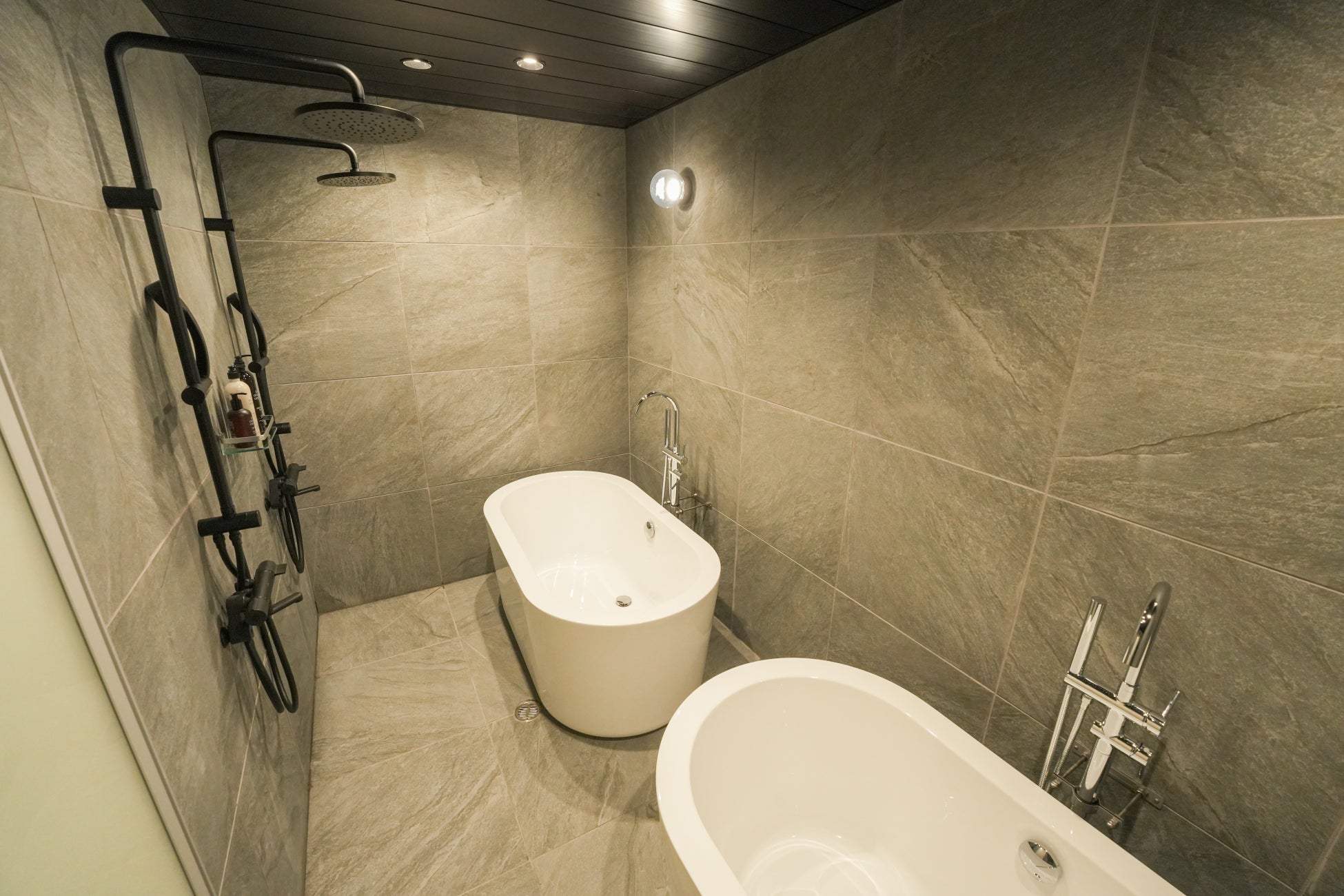 贅沢な2台の独立型バスタブを備えた、広々としたバスルーム。
