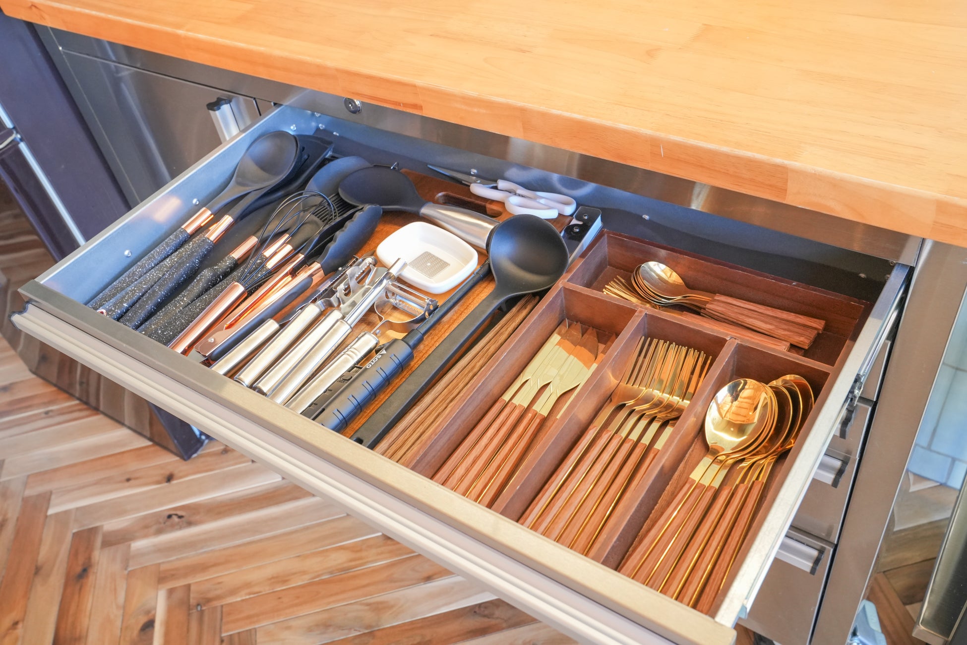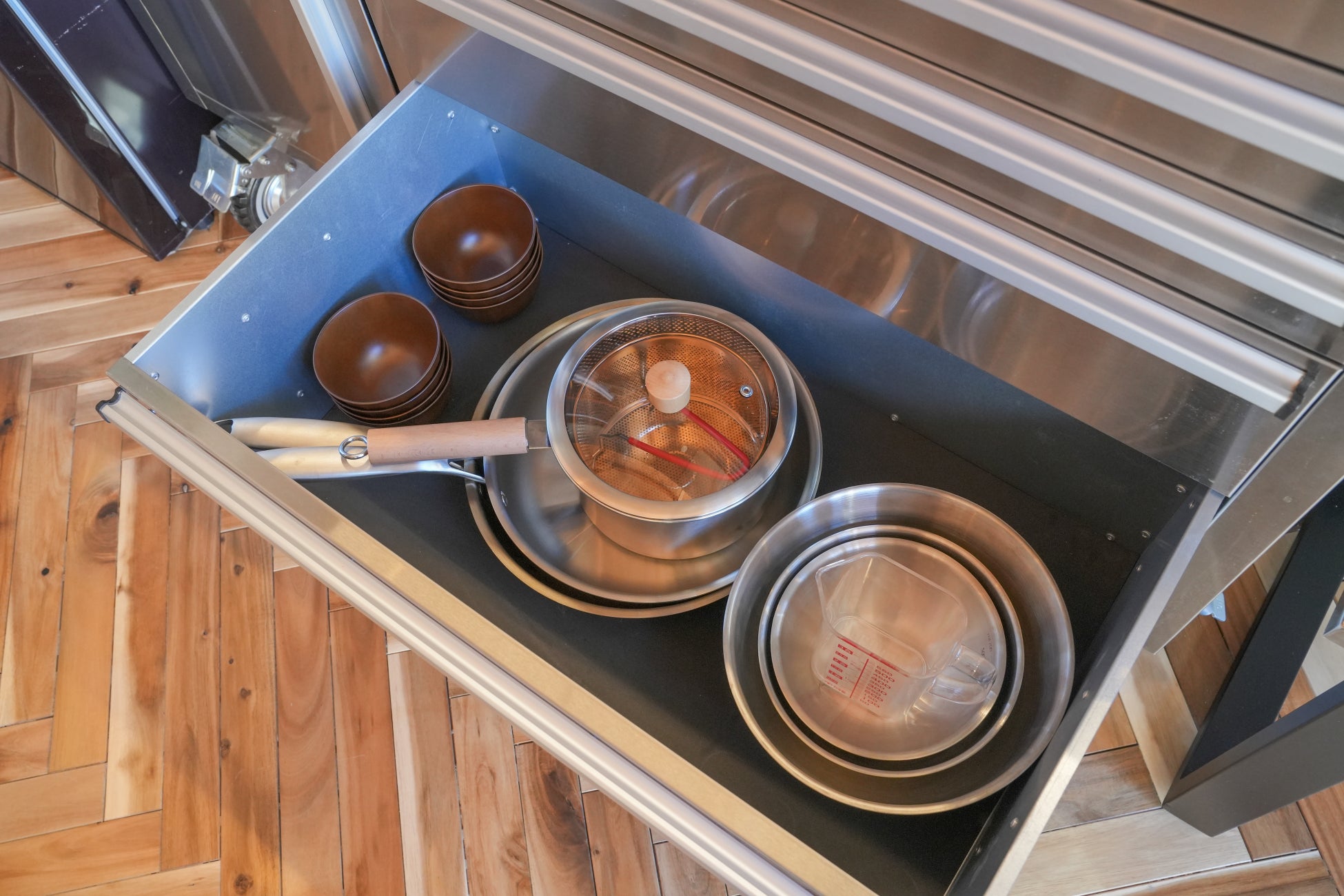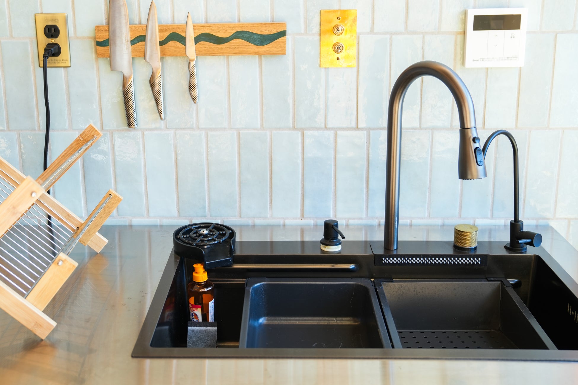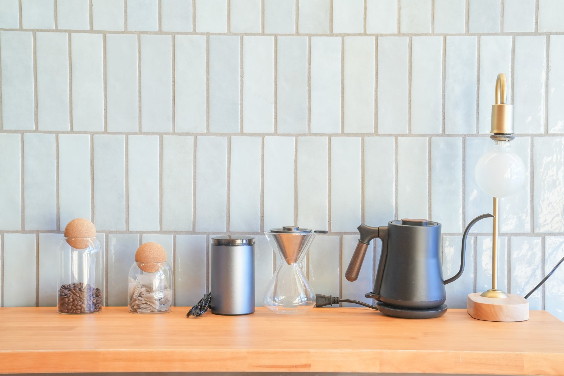 明るく清潔感あふれるキッチンには、ガスコンロ、オーブンレンジ、トースター、電気ケトル、調理器具一式が完備されており、自炊派にもぴったり。木とステンレスを組み合わせたモダンなデザインが、旅先での料理をより楽しく演出してくれます。