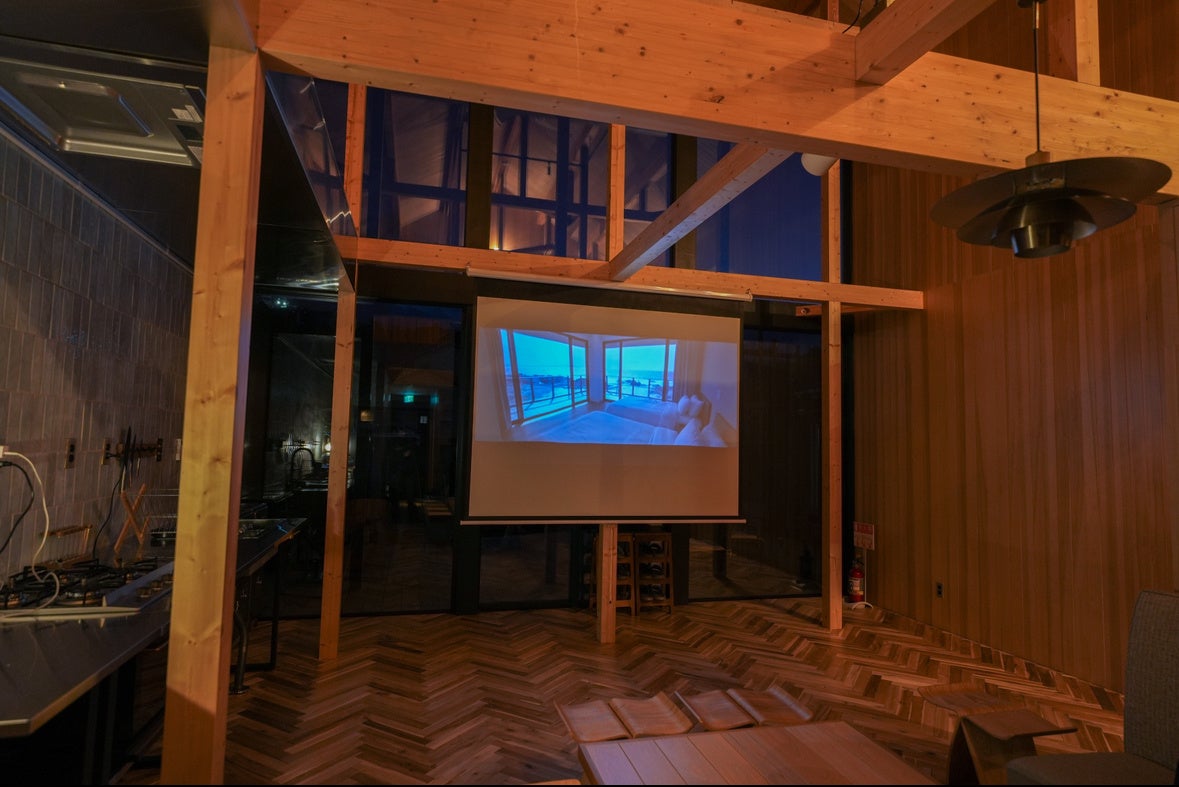 温かみのある木材に包まれたリビングには、ロールスクリーンを完備。日が落ちた後は、映画やお気に入りの映像を流してゆったりとした時間をお楽しみいだけます。