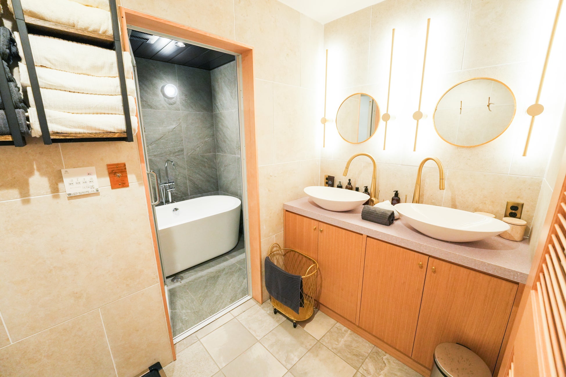 落ち着いたトーンのタイルと温かみある木目が調和した、スタイリッシュな洗面スペース。2ボウルの洗面台にはミラーと間接照明が備わり、ゆったりと朝の身支度やスキンケアタイムをお楽しみいただけます。