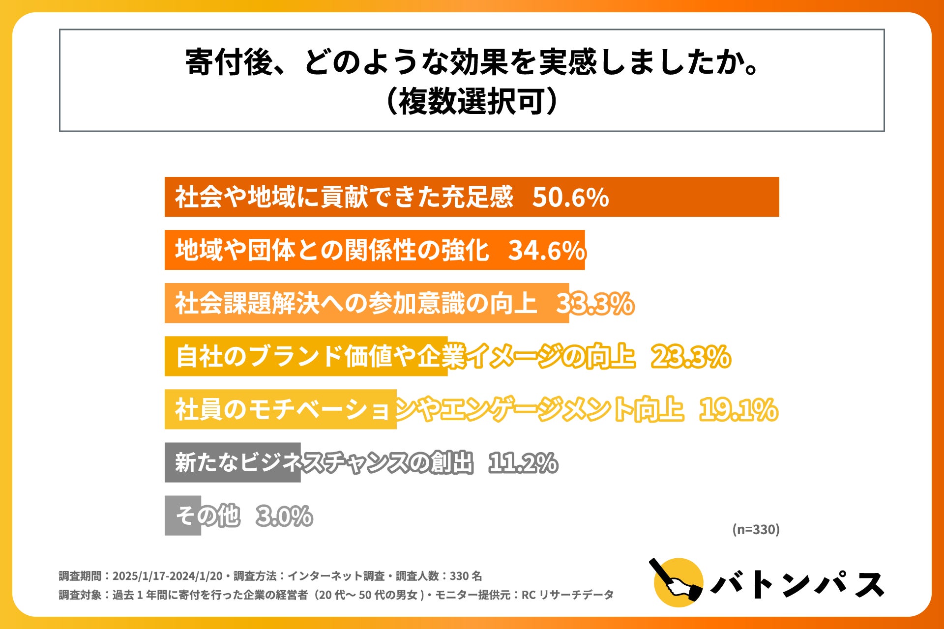 次に「寄付後、どのような効果を実感したか」を問う設問への回答では、1位が「社会や地域に貢献できた充足感」で50.6%、2位が「地域や団体との関係性の強化」で34.6%、3位が「社会課題解決への参加意識の向上」で33.3%という結果になりました。この結果から、社会や地域に貢献できた充足感や具体的な地域や団体との関係性の強化を実感した企業経営者が多い、ということが明らかになりました。