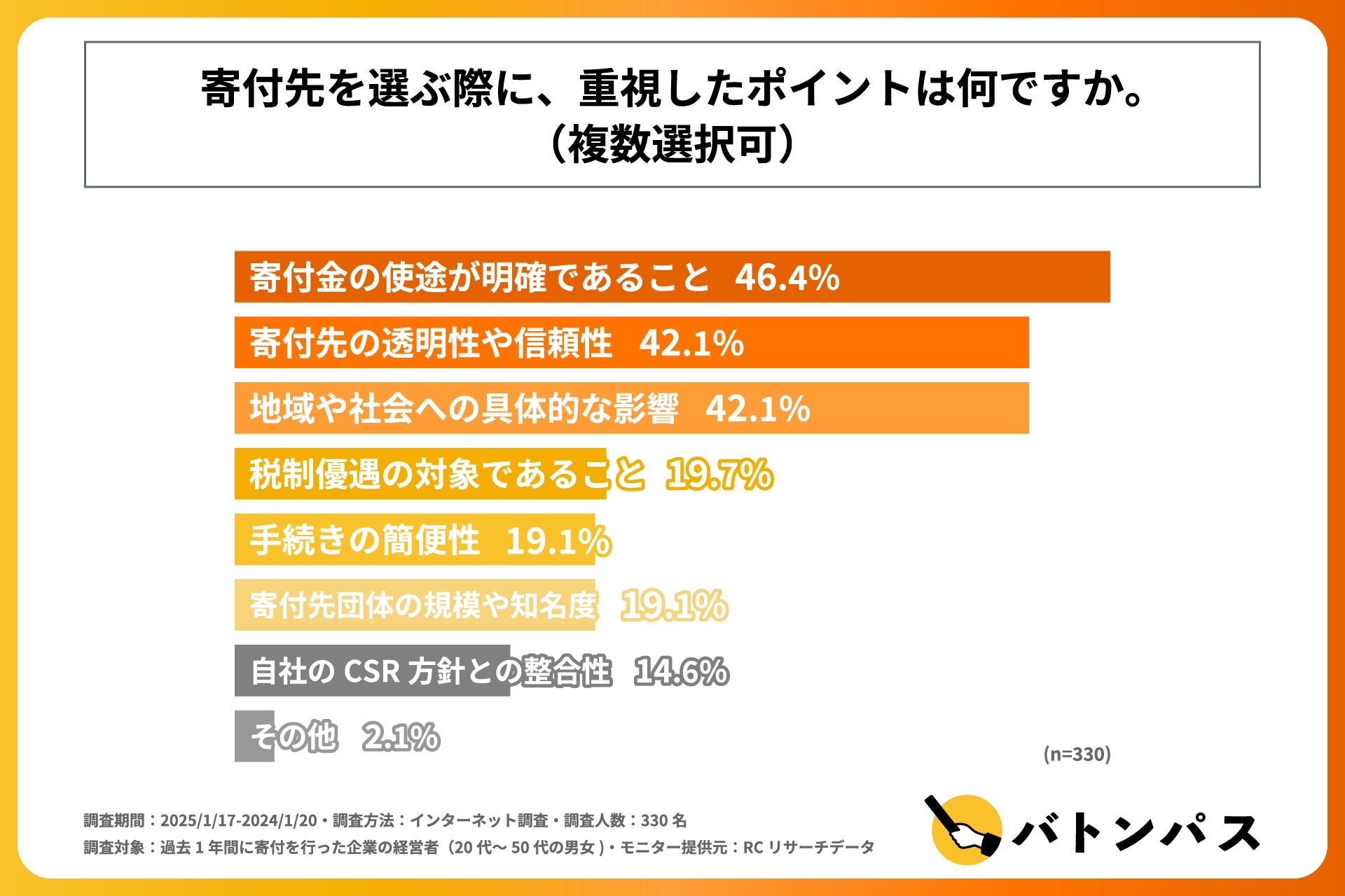 寄付先を選ぶ際に重視した主なポイントは「寄付金の使途の明確さ」「寄付先の透明性・信頼性」「地域や社会への具体的な影響」