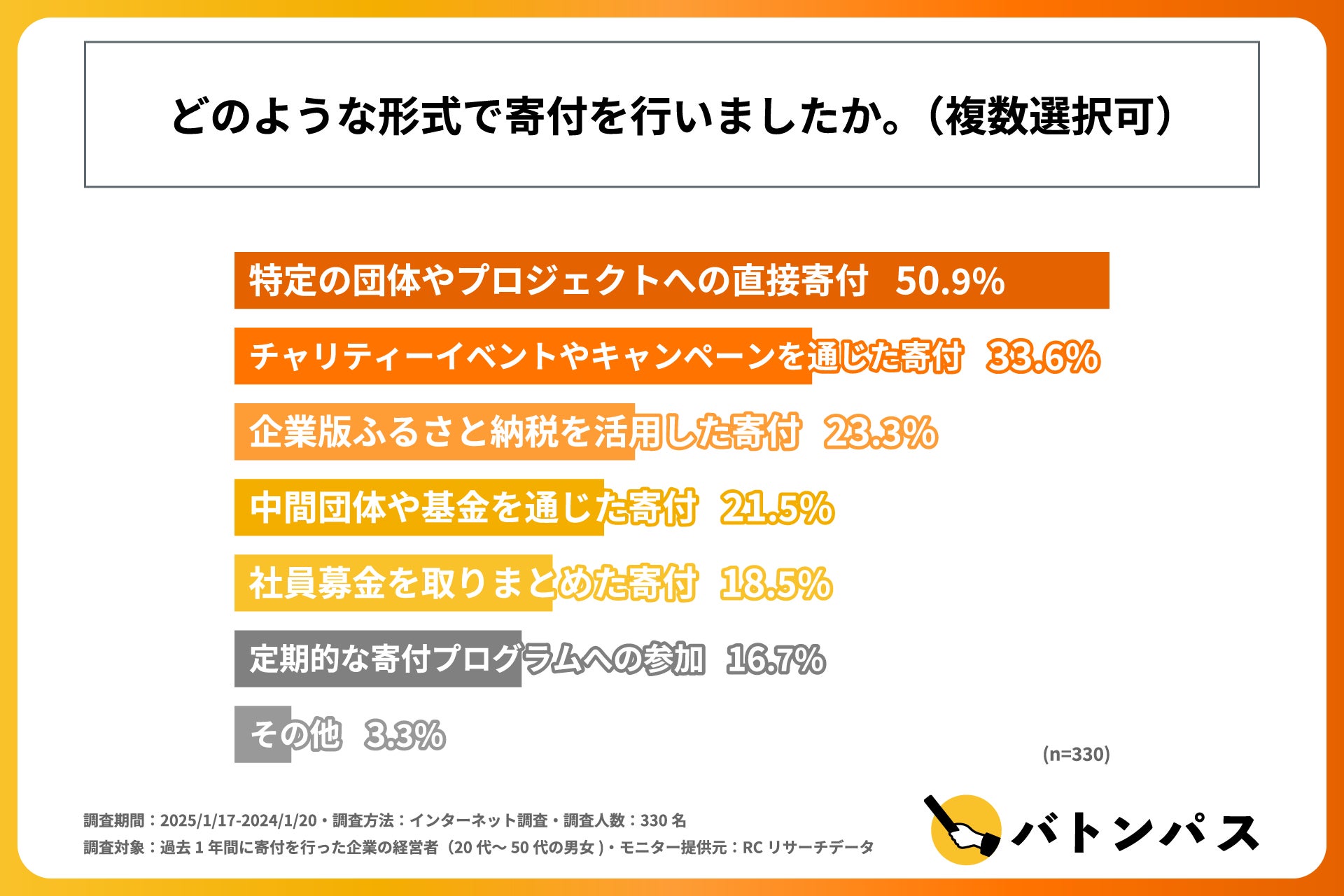 まず、「どのような形式で寄付を行ったか」を尋ねる設問への回答では、1位が「特定の団体やプロジェクトへの直接寄付」で50.9%、2位が「チャリティーイベントやキャンペーンを通じた寄付」で33.6%、3位が「企業版ふるさと納税を活用した寄付」で23.3%という結果になりました。この結果から日本企業が行っている最も多い寄付の形式は「特定の団体やプロジェクトへの直接寄付」であることが明らかになりました。