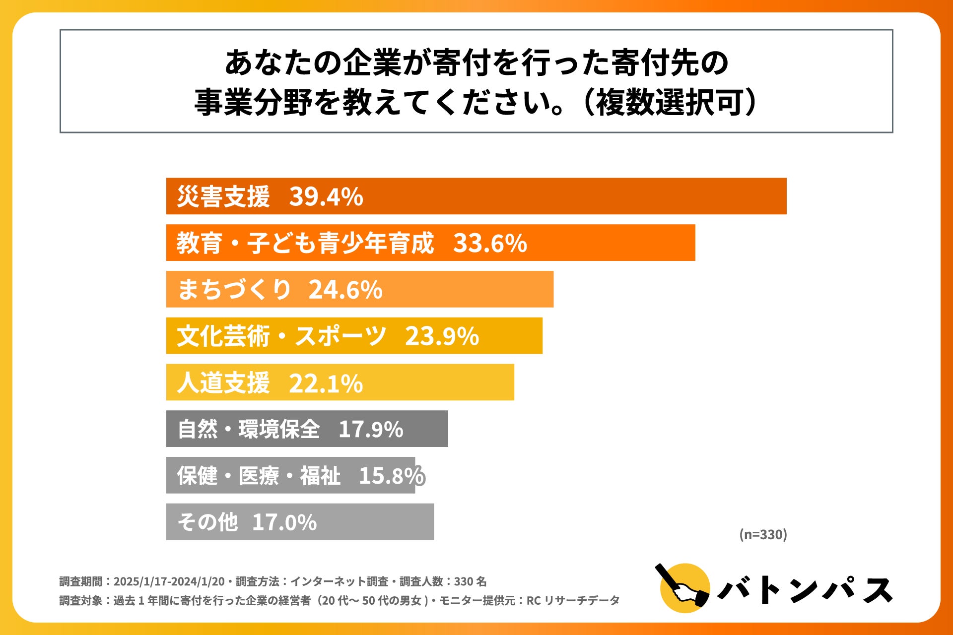 近年、社会貢献や地方創生への関心が高まっている一方で、日本では人助けの文化が十分に根付いていないと言われています。その実態を示す一例として、イギリスのチャリティー機関CAFの「World Giving Index 2024(世界人助け指数/世界寄付指数)」(https://www.cafonline.org/docs/default-source/inside-giving/wgi/wgi_2024_report.pdf)では、日本が142か国中141位という結果が報告されています。では寄付行動が持つ可能性を再認識し、より多くの人々にとって身近な行動にするためには、どのような仕組みや情報が必要なのでしょうか。そこで、「バトンパス」は、過去1年間に寄付を行ったことがある企業の経営者を対象に、「企業の寄付行動」に関する実態調査を実施しました。