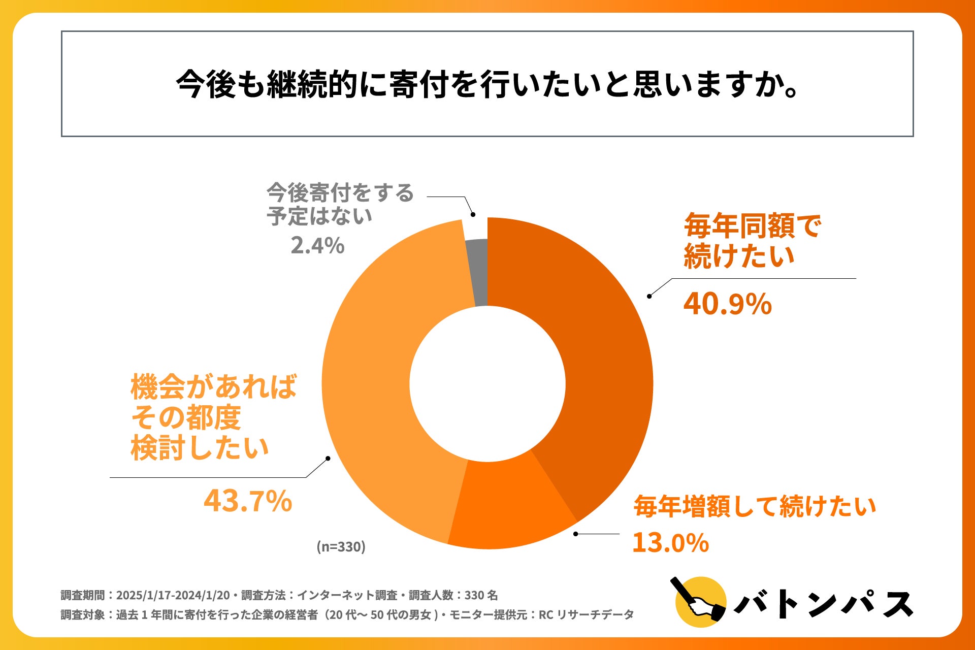 調査の最後、「今後も継続的に寄付を行いたいと思うか」を尋ねる設問への回答で多かったのは、1位が「機会があればその都度検討したい」で43.7%、2位が「毎年同額で続けたい」で40.9%、3位が「毎年増額して続けたい」で13.0%という結果になりました。この結果から、95%以上の企業経営者が、今後も寄付を継続的に行っていく意向があることが明らかになりました。