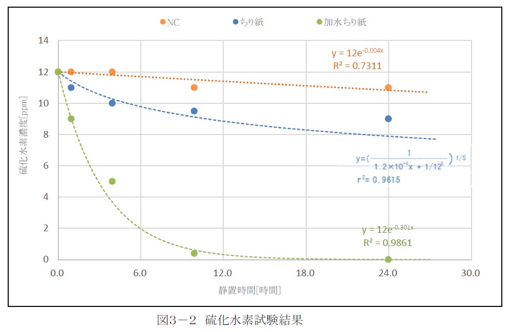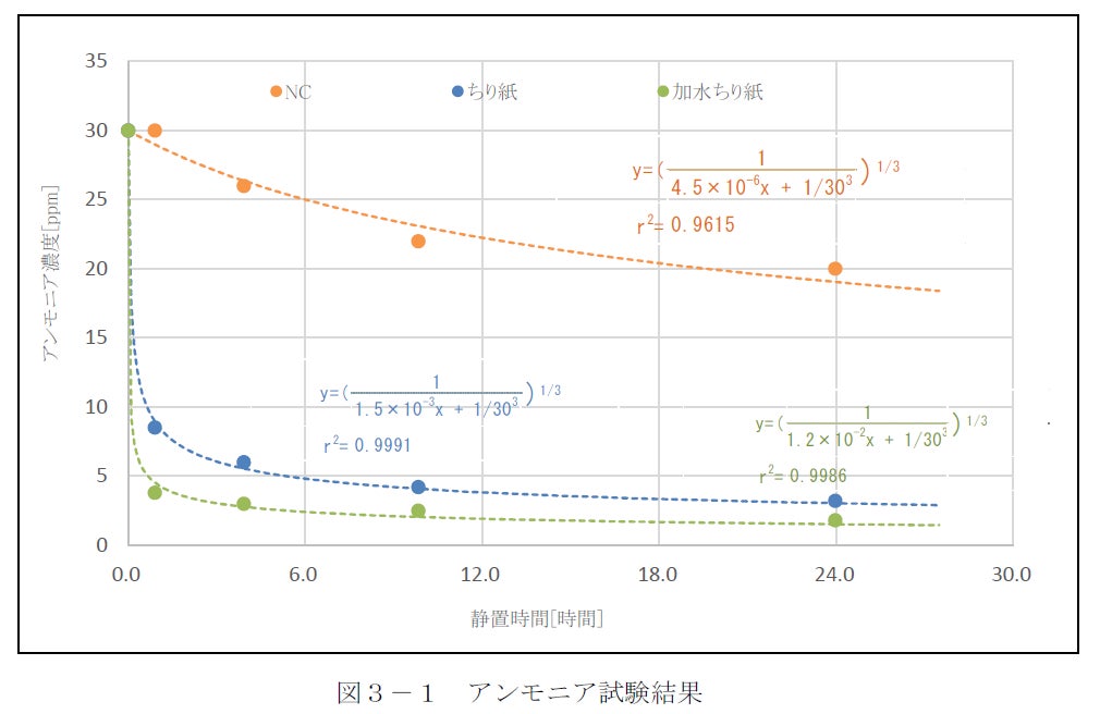 アンモニアのグラフでは、青色と緑色の線が、すぐに下降しているのが分かります。具体的な数字では、水分を含んだ「めりふわ」(加水ちり紙)は54分(0.9時間)経たずに、においの実測値が約87%減少しました。9時間48分(9.8時間)後は92%減っています。
