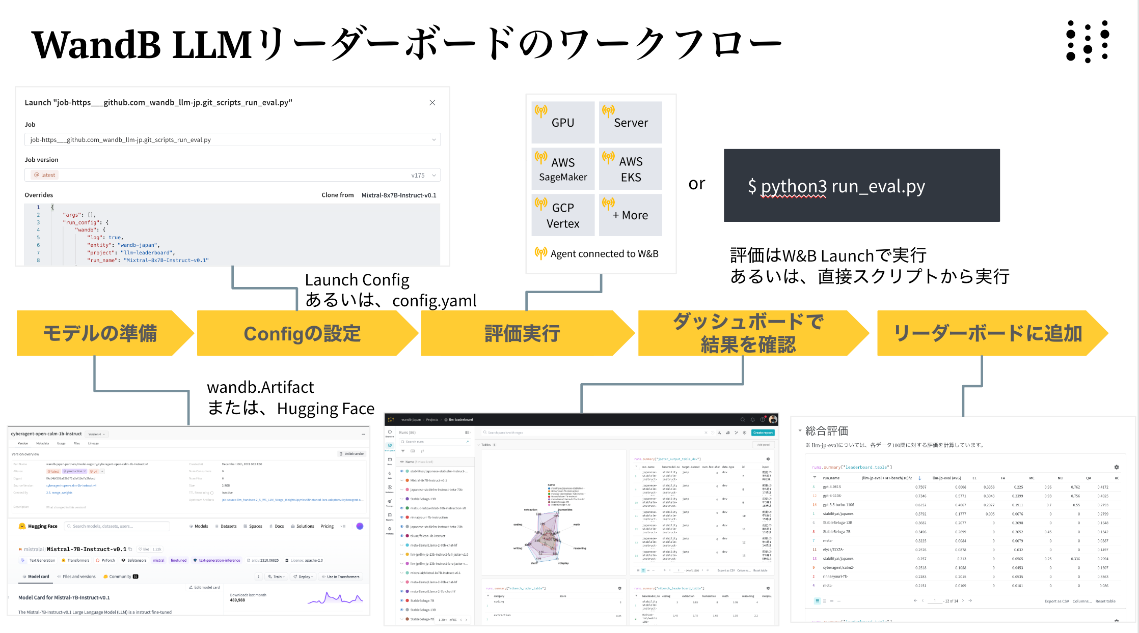 本リーダーボードで使われている評価フレームワークはWandBを使ってどなたでも実行することが可能です。リーダーボード評価に使われたコードはGitHub上(https://github.com/wandb/llm-leaderboard/tree/main)に公開されており、このコードを使うことで、結果を公開しない形で自社のモデルを評価することも可能です。この仕組みの利用方法については、2024年1月24日に予定されているウェビナーにて詳しく説明いたします。