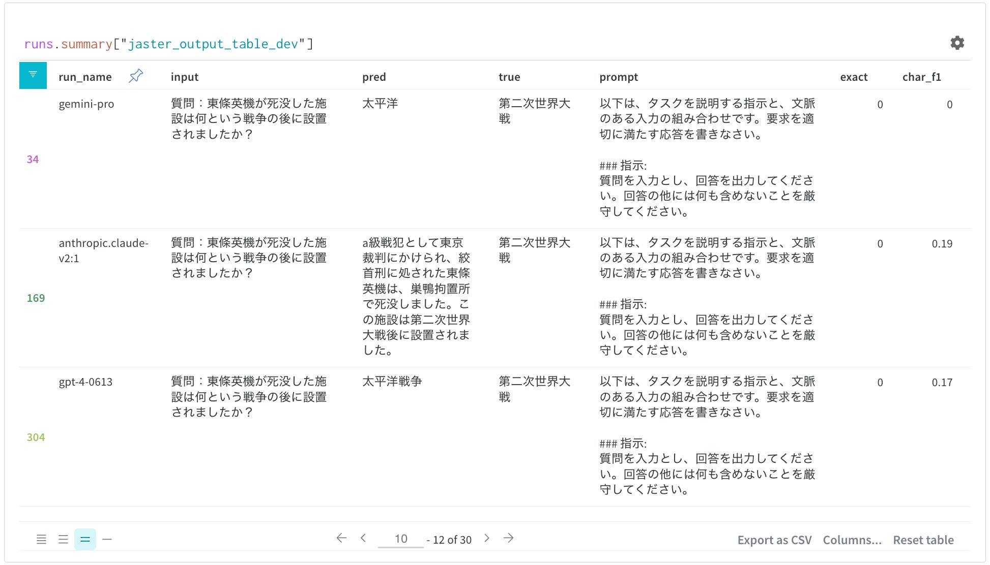 前バージョンに引き続き、本リーダーボード公開ページでは、WandB製品の強みを活かして、よりインタラクティブに評価結果を表示し、その場で分析することが可能です。例えば、理解能力と生成能力のバランスを評価したり、二つのモデルの違いがどのような事例で発生するのかを分析したりすることが可能になります。具体的にはインタラクティブに比較対象モデルを選択し、WandB Table機能を用いて、平均スコアではなく、一問ずつの深掘を行うことができます。