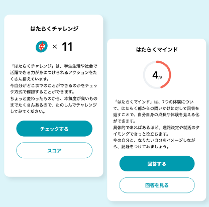 「学びや気づき」を記録し、はたらく部が提示する9つの力を身につけるためのチャレンジ項目への取り組みを確認することで、行動や体験をもとにした成長を実感することができます。