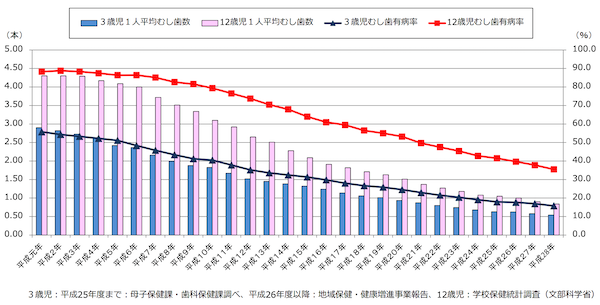 文部科学省学校保健統計調査によると、3歳児、12歳児ともに虫歯本数、虫歯有病率は年々減少している状況です。これは、子どもの口腔環境に対し、意識する保護者の増加が考えられます。
