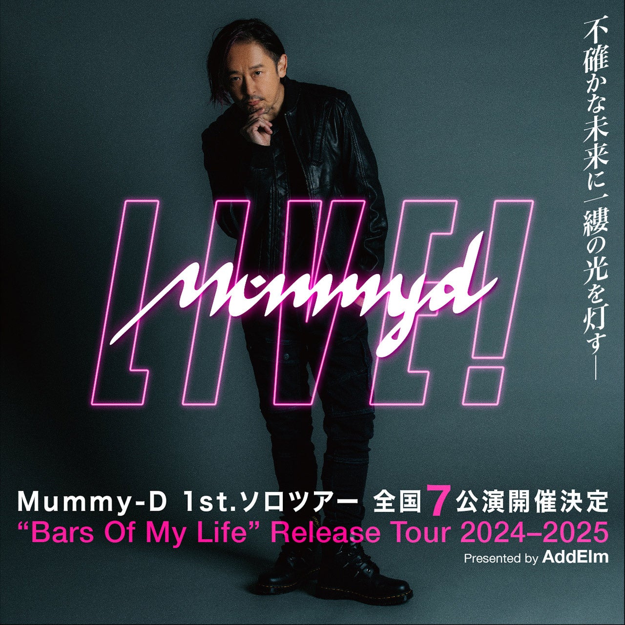 Mummy-D氏キャリア初の全国ソロツアーが12月20日(金)からスタートいたします。東京、名古屋、大阪など全国7都市を巡り、さかいゆう氏、H ZETTRIO氏、ILL-BOSSTINO氏、ミッキー吉野氏といった豪華ゲストも参加するツアーにAddElmが協賛をすることが決定いたしました。