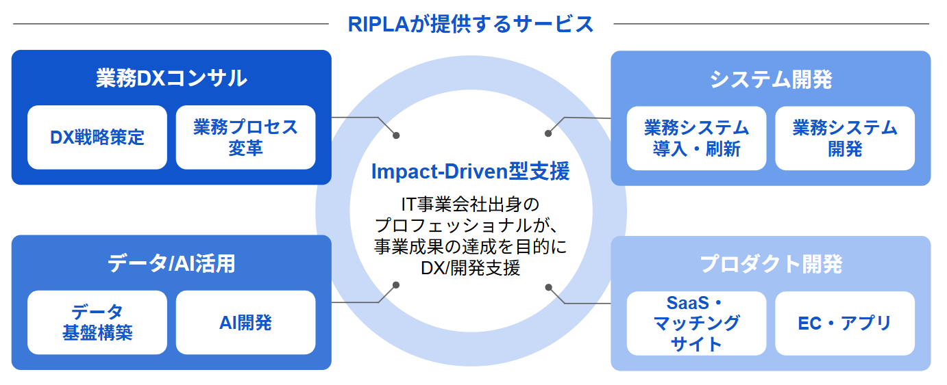 リプラは「事業成果にコミットするDX・開発支援会社」です。IT事業会社出身のプロフェッショナルが、単なるシステム納品を目的とするのではなく、クライアント企業と同じ目線で事業成果の達成にコミットする「Impact-Driven型支援」を提供しています。