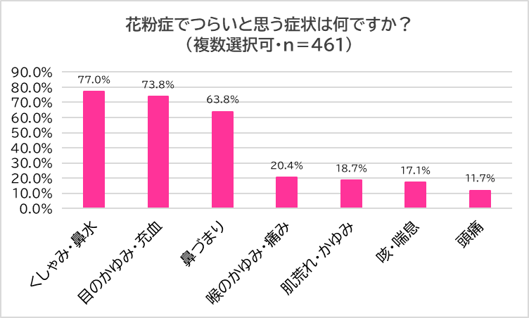 花粉症と答えた461人に「花粉症でつらいと思う症状は何か?」尋ねました。最多は「くしゃみ・鼻水」(77.0%)、「目のかゆみ・充血」(73.8%)、「鼻づまり」(63.8%)も多く目立ちました。