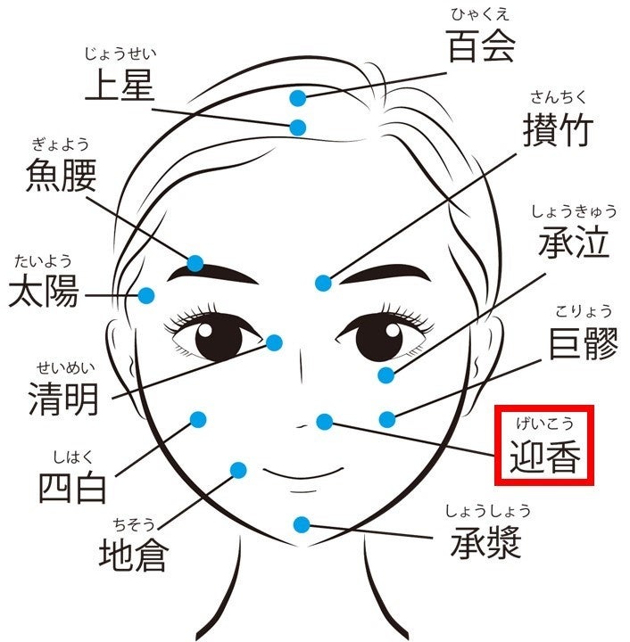 鼻づまりを改善する「迎香(げいこう)」というツボが小鼻の横にあります。まず、そこを指で押し、そのまま指の力を下に向けて押します。次に小鼻横にある空洞を広げる感じで、押したまま力を真横に引きます。この副鼻腔を広げるマッサージを10秒やりましょう。お風呂に浸かりながら湯気の中でやっていると鼻づまりがどんどん改善していきます。