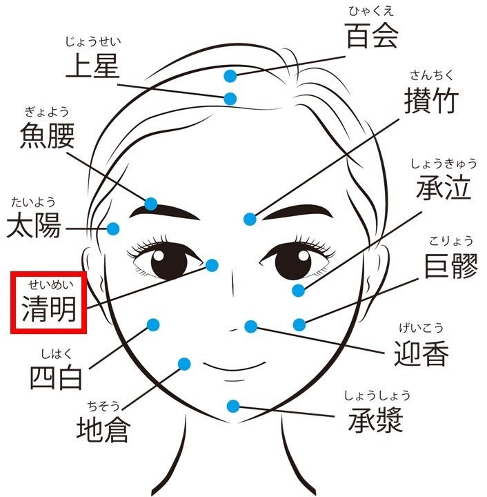 また、目頭と鼻筋の真ん中くらいところに、触ると凹むところがあります。その「清明(せいめい)」というツボを押してみてください。同時に目尻の横も一緒に押します。上下左右に押すのではなく、顔の中心部に向かって真っすぐ10秒押します。この際、目頭に指が入らないように注意してください。押していると、徐々にかゆみが治まってくると思います。