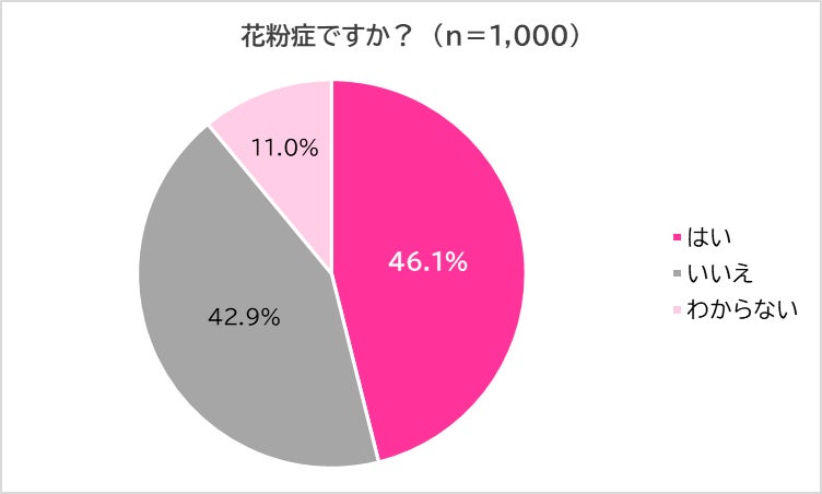 まず、「花粉症か?」尋ねたところ、約半数(46.1%)が「はい」と回答。「いいえ」(42.9%)、「わからない」(11.0%)となりました。