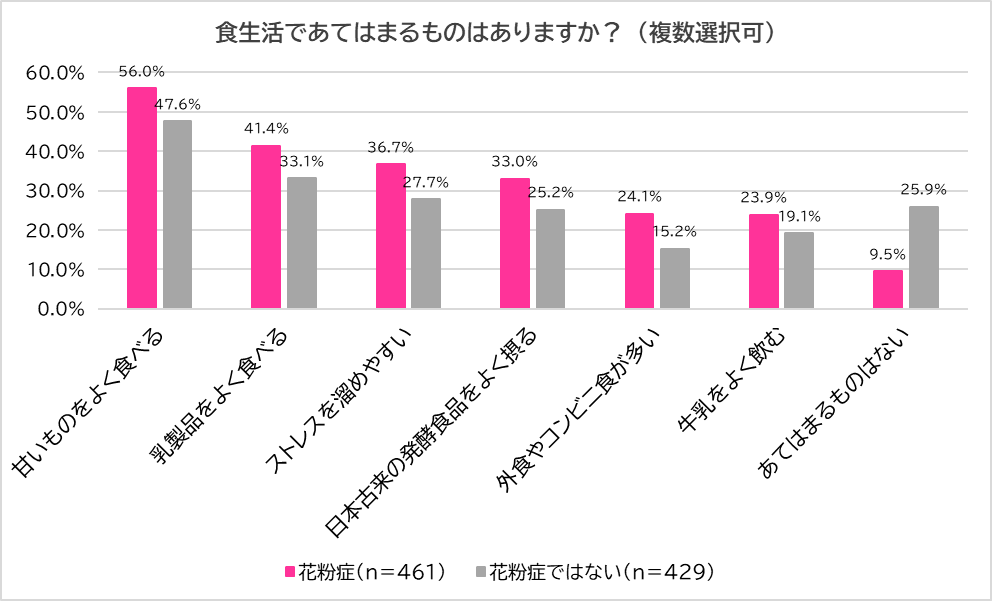 最後に、花粉症の461人、花粉症ではない429人それぞれに「食生活であてはまるものはあるか?」尋ねました。花粉症か否かに関わらず最多は「甘いものをよく食べる」(花粉症:56.0%、花粉症ではない:47.6%)、以下「乳製品をよく食べる」(花粉症:41.4%、花粉症ではない:33.1%)、「ストレスを溜めやすい」(花粉症:36.7%、花粉症ではない:27.7%)と続き、「あてはまるものはない」以外はすべて花粉症の人の方が花粉症ではない人よりも多い結果となりました。