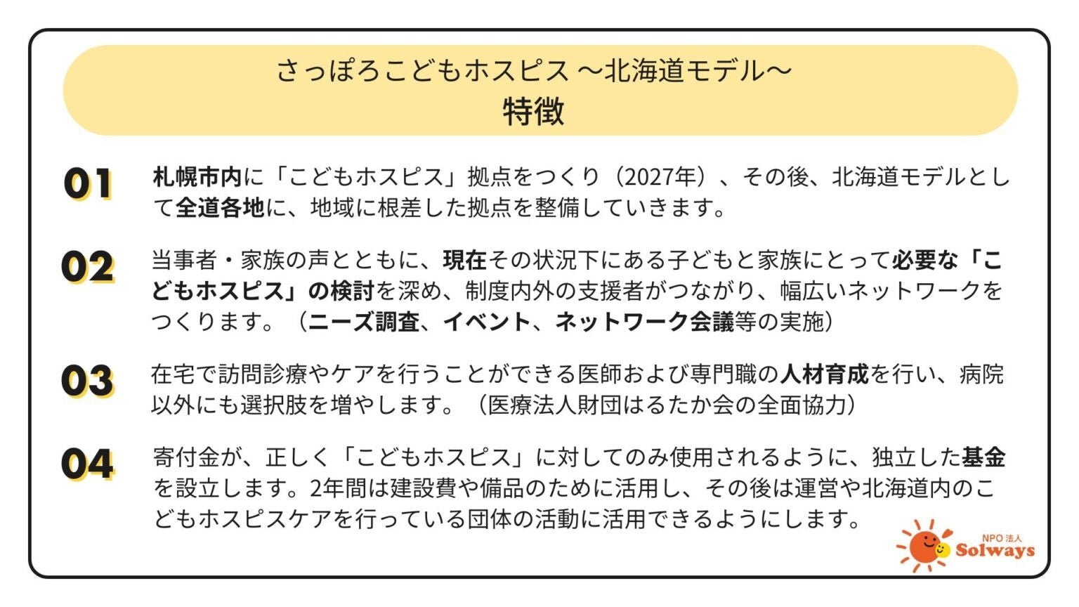 NPO法人ソルウェイズは、2027年札幌市内に「こどもホスピス」拠点をつくります。建物がゴールではなく、当事者・家族、医療・福祉施設や非営利団体、地域の団体や企業等でネットワークをつくり、LTCの子どもと家族の両方を対象として、その地域に合った小児緩和ケア、レスパイトケア、ターミナルケア、家族支援等が行える地域づくり、社会づくりを行います。その活動がこどもホスピスケアであるとソルウェイズでは考え、北海道全体に広がるロールモデルとなるような活動を実施します。