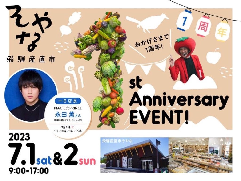 岐阜県飛騨市の道の駅「アルプ飛騨古川」にある農産物直売所「飛騨産直市そやな」がオープン1周年を迎えるにあたり、2023年7月1日(土)・2日(日)に感謝祭を開催します。2日目には飛騨市観光プロモーション大使を務めるMAG!C☆PRINCE(マジックプリンス)永田薫さんが「1日店長」を務め、皆さんをおもてなしします。