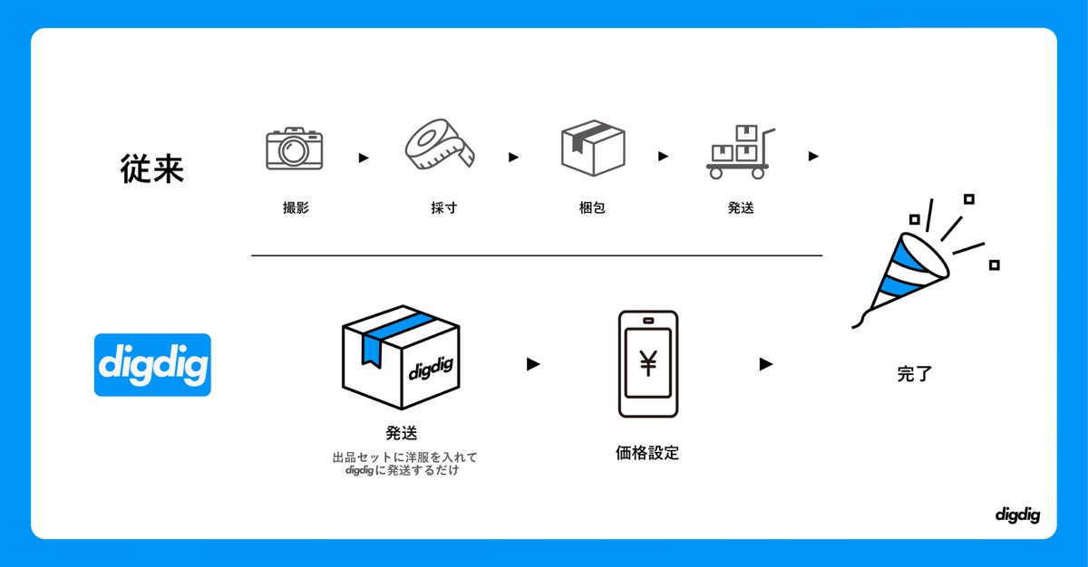 ユーザーは、digdigから送られてくる袋(出品キット)に洋服を詰めて発送し、希望する販売価格を入力するだけで、出品作業は終了。採寸・撮影・梱包・発送業務は全てdigdig側で行い、洋服を販売いたします。