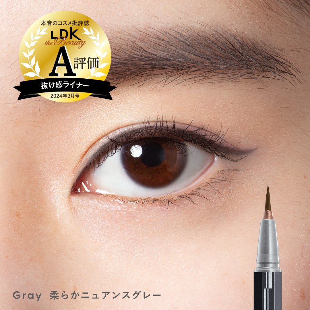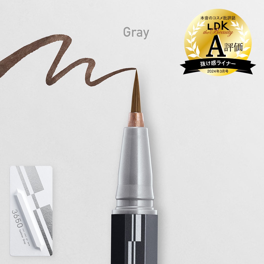 「抜け感ライナー部門」でA評価を獲得した『3650 リキッドアイライナー グレー』は、柔らかいニュアンスグレー。黒よりもインパクトが強すぎず、ブラウン程柔らかくなりすぎない、抜け感のある絶妙カラーが特徴。瞳の色やまつげの質感にもなじんで、透明感*1のあるナチュラルな目元に仕上がります。