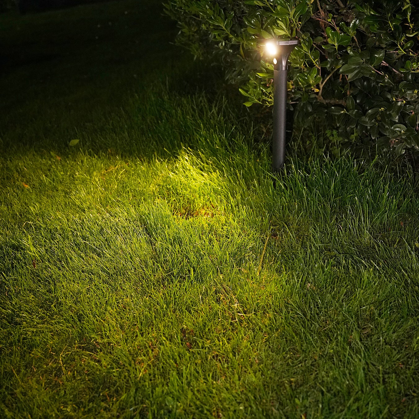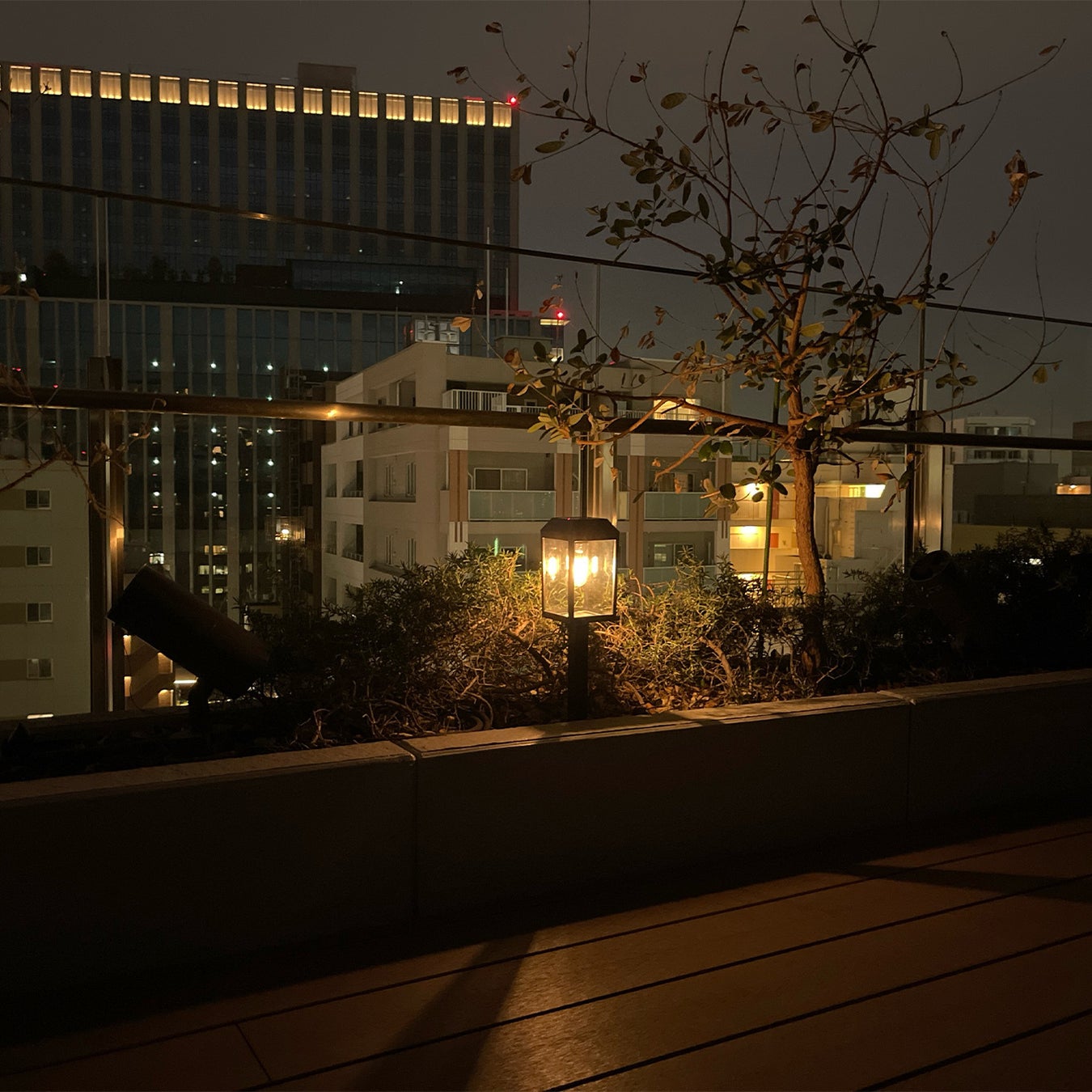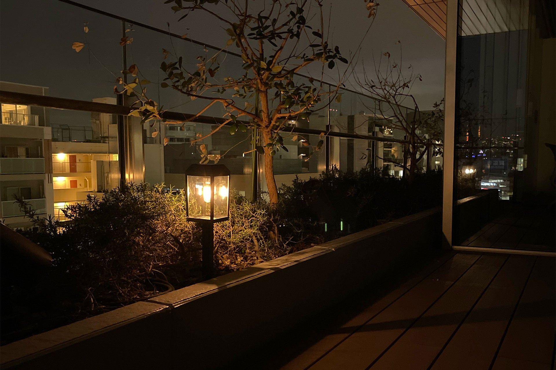 日が暮れると柔らかな明かりが点灯。さらに人が近づくと人感センサーでフル点灯し、しっかりと足元を照らすので夜間の玄関先などの使用に最適です。またフル点灯後30秒後に20%程度に調光します。