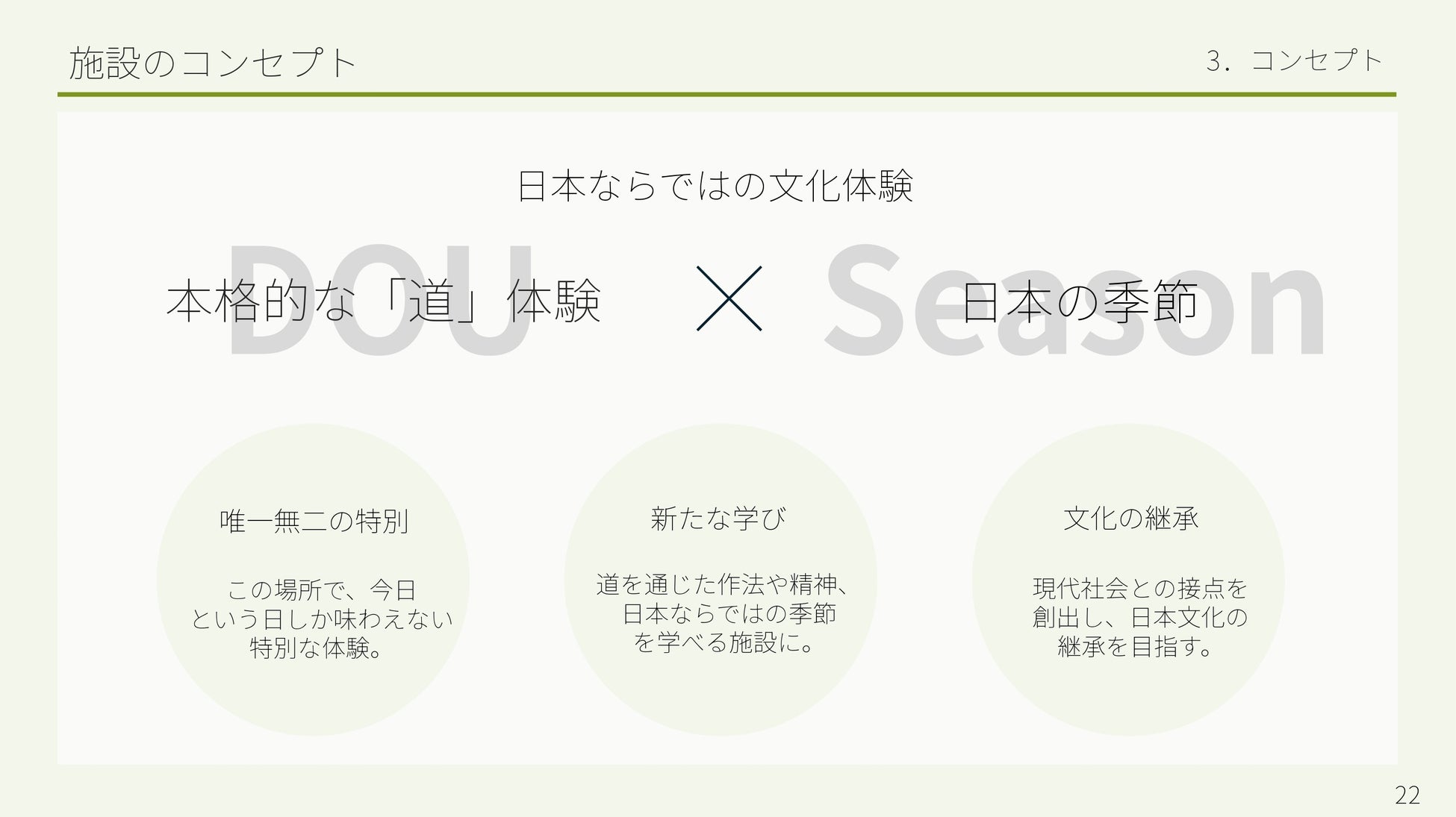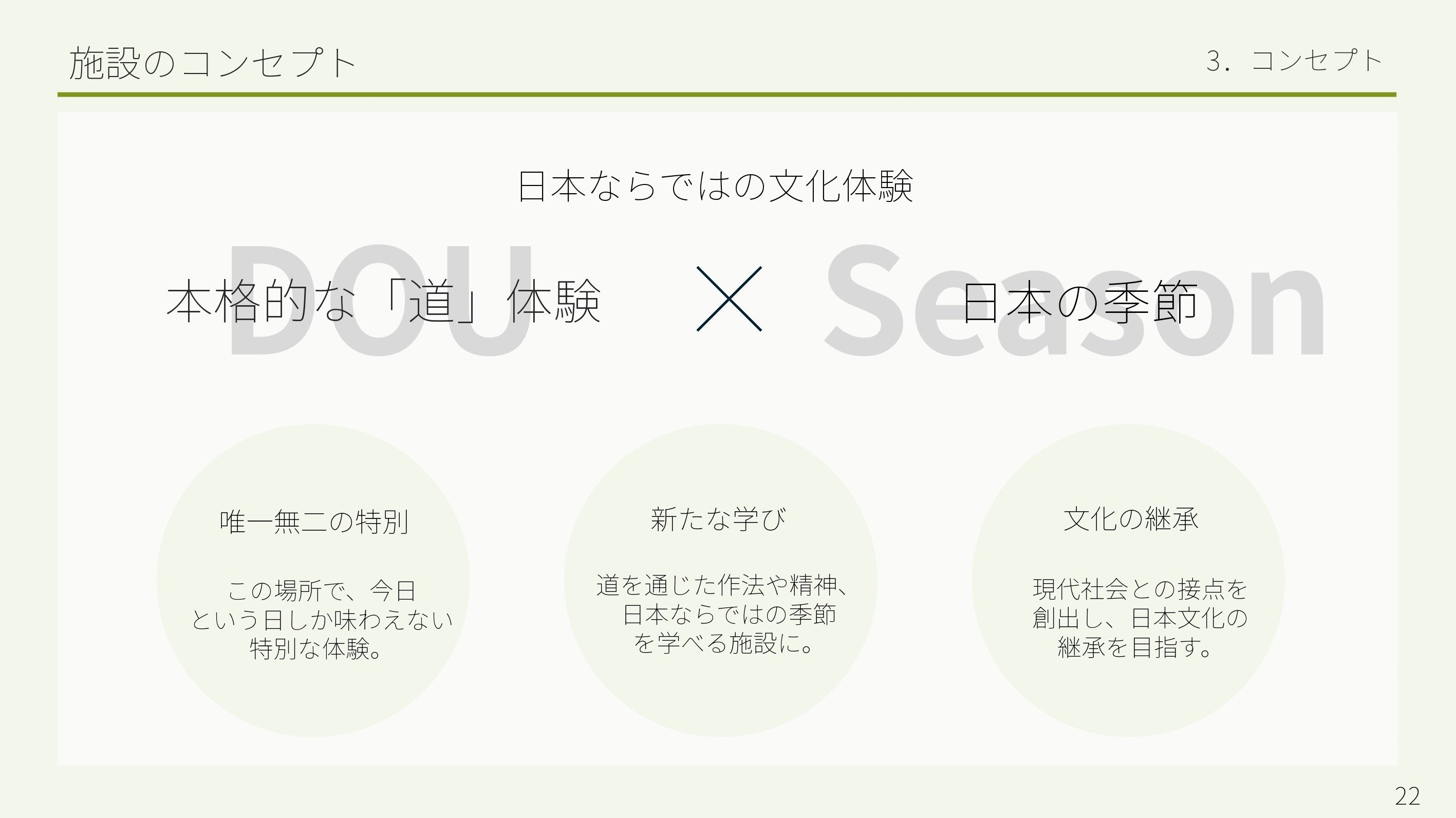 浜松町エリアが有する国際的なMICE拠点としてのポテンシャルに着目し、報奨旅行で訪日する外国人を主なターゲットとした文化体験施設「季和苑」を提案しました。弓道や茶道といった日本文化に根付く「道」と、日本ならではの四季を掛け合わせた体験設計により、滞在時間の伸長や記憶に残る高付加価値な体験創出につながる点が高く評価されました。