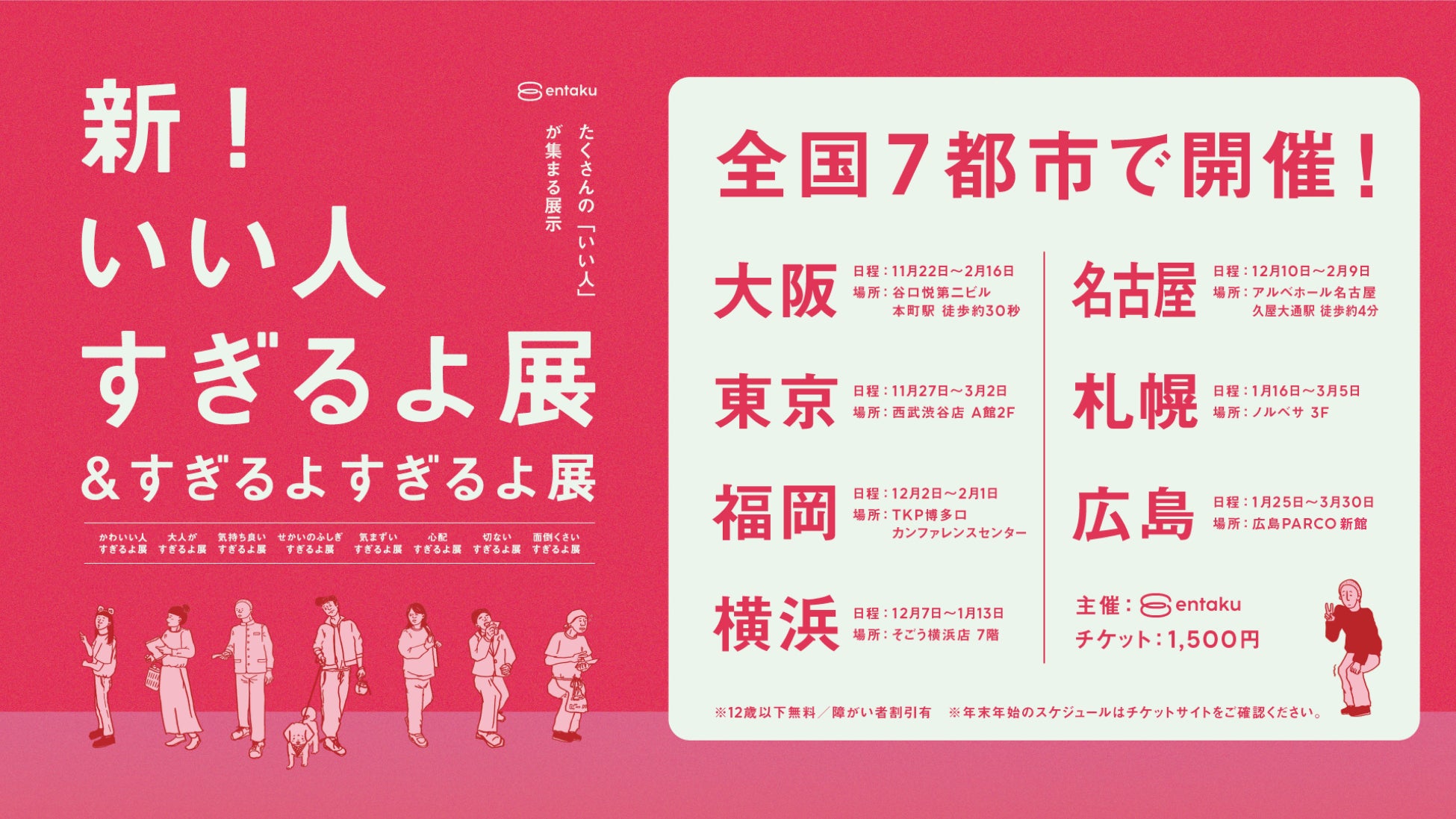 『友達がやってるカフェ/バー』『JANAI COFFEE/JANAI GAMES』『いい人すぎるよ展』『やだなー展』などを手掛けるクリエイティブディレクター・明円卓を中心としたチーム『entaku』は、新たな企画展として『新!いい人すぎるよ展&すぎるよすぎるよ展』を全国7都市(大阪、東京、福岡、横浜、名古屋、札幌、広島)の会場にて開催いたします。