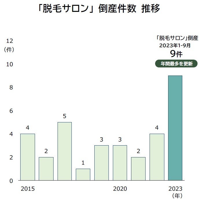 帝国データバンク『全国企業倒産集計2023年度上半期報・9月報』によると、エステ脱毛を中心とする「脱毛サロン」の倒産は、2023年に9件で過去最多件数を更新しました。脱毛サービス終了の発表や水面下の私的整理、廃業といったケースを含めれば、実際はより多くの脱毛サロンが市場から淘汰されたとみられます。