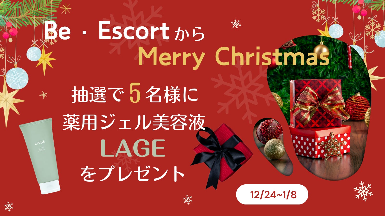 23周年の感謝を込めて、X(旧:ツイッター)を『ビー・エスコート』公式SNS上で、クリスマスの12月24日より開始いたします。ご参加いただいた方の中から抽選で5名様に、「ビー・エスコート」が運営する公式オンラインショップ「ビー・エスマート」の薬用ジェル美容液『LAGE』がプレゼントされます。