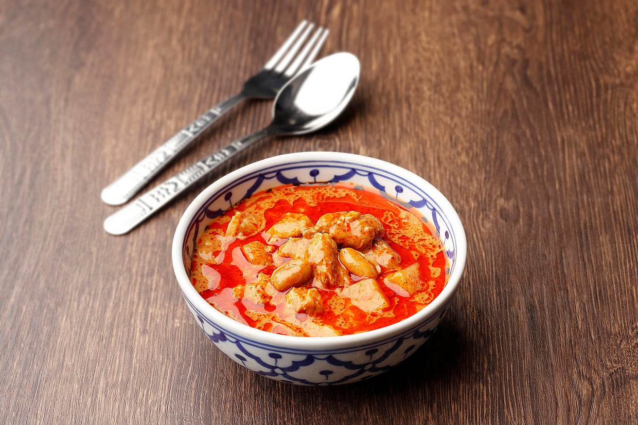 タイでの正式名称は「ゲーン・マッサマン」と言い、「イスラム教徒のカレー」という意味合いになります。タイ南部に多いイスラムの方の料理とタイ料理の融合から生まれたと言われており、豚肉は使わず、主に鶏肉や牛肉、羊肉などで作られるタイカレーです。レッドカレーやグリーンカレーなど他のタイカレーに比べて辛さは控えめで、ココナッツミルクやじゃがいもなどによるコクや甘み、タマリンドペーストによる酸味が特長的です。