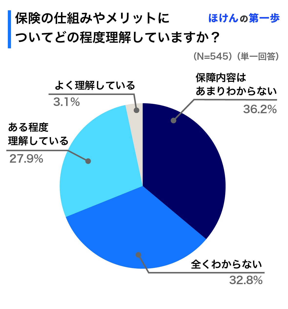 保険の仕組みやメリットについて、どのくらい理解しているかを聞いたところ、「よく理解している」「ある程度理解している」の合計が約30%を占める結果になりました。一方で、「保障内容はあまりわからない」「全くわからない」の合計は約70%と圧倒的に多数です。