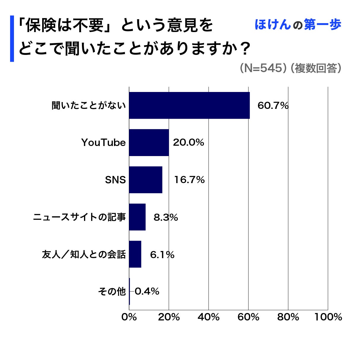 実際にZ世代が「保険は不要」という意見をどこで聞いたことがあるかを調査したところ、「聞いたことがない」が60%以上と多数を占めました。続いて、「YouTube」「SNS」が挙がっています。