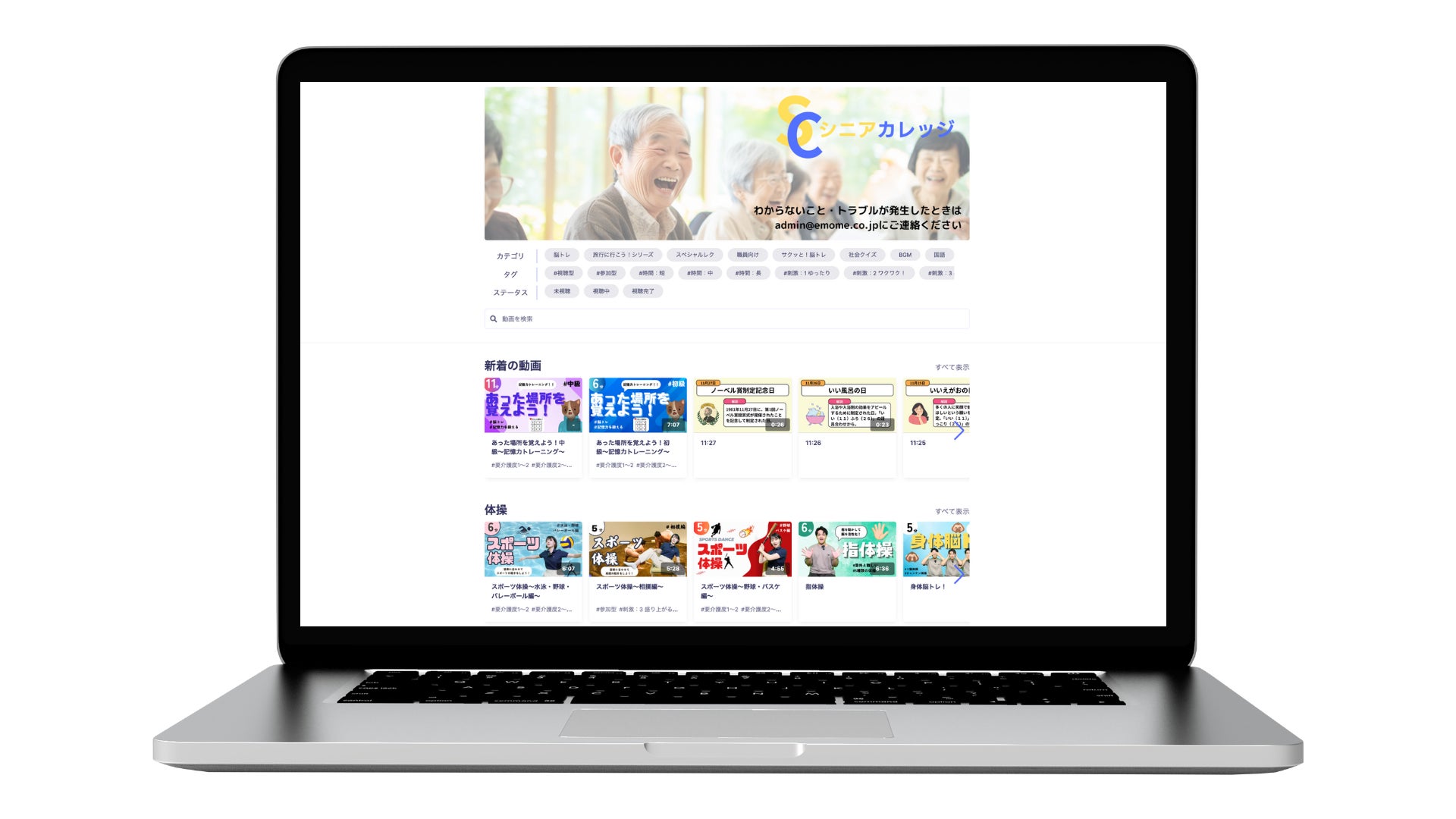 株式会社emomeが提供する「シニアカレッジ」は、映像を活用した新しい形のレクリエーションクラウドです。毎月30本映像コンテンツが更新され、事業所はシニアカレッジに配信されているコンテンツを使って利用者に向けたレクリエーションが実施できます。