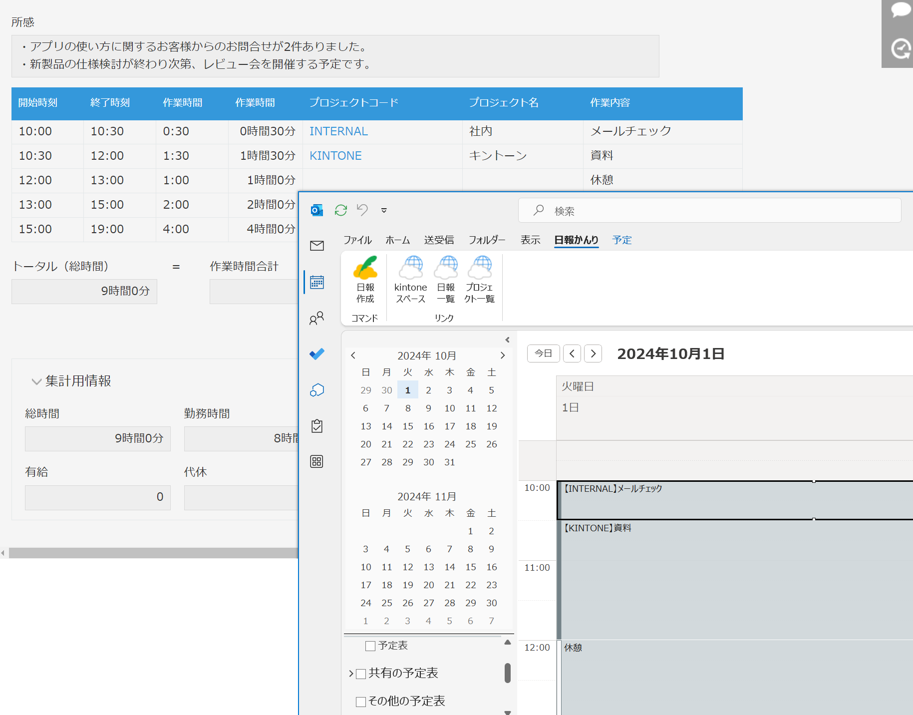Microsoft Outlookの予定表からkintoneのレコードを簡単に追加し、勤務管理・集計を効率化。