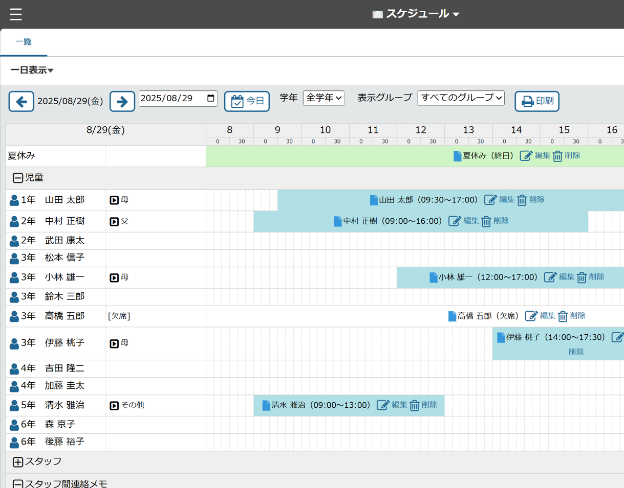 児童の出欠情報やスタッフの勤務状況の管理など、学童クラブ運営に特化。