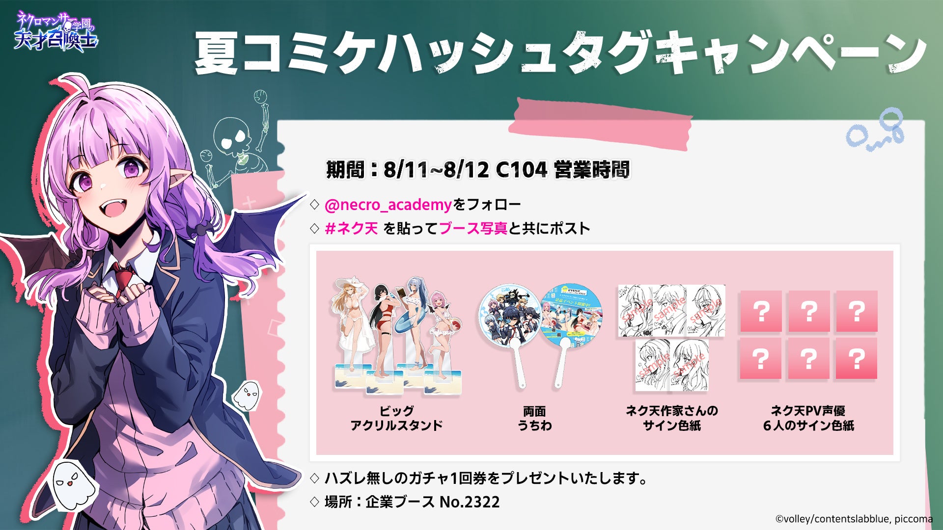 株式会社Contents Lab. Blue(本社:韓国ソウル、代表取締役:ゴ・ヨント、株式会社Contents Lab. Blue Tokyoは日本法人)と株式会社カカオピッコマ(本社:東京都港区、代表取締役社⻑:金在龍)と共同制作した作品「ネクロマンサー学園の天才召喚士」において、8月11日から8月12日までの2日間、「コミックマーケット104」に出展いたしました。