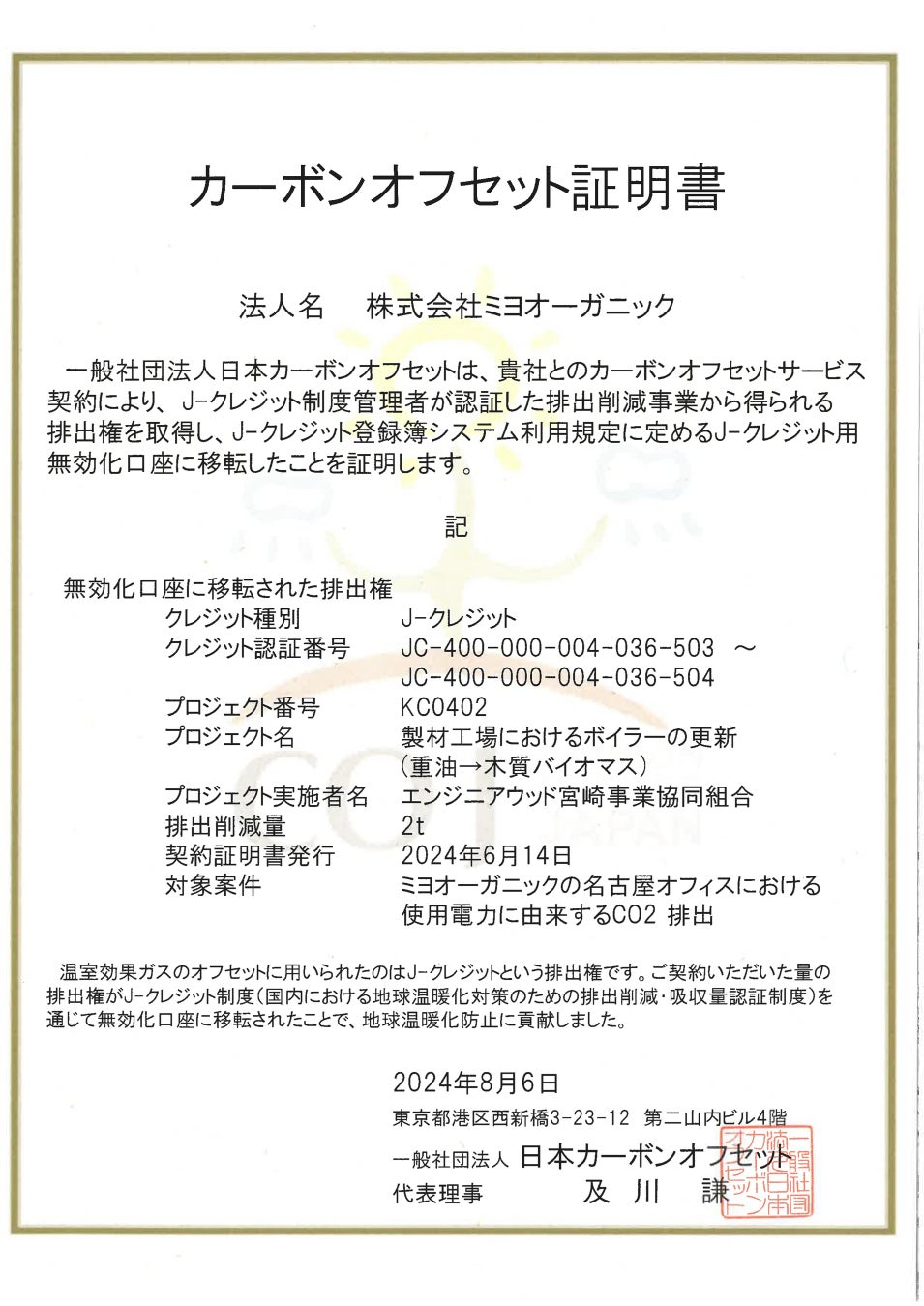 「美しい地球を、次の世代へ。」をパーパスに活動する株式会社ミヨオーガニック(本社:愛知県名古屋市、代表:山本美代)が提供するエシカルセルフケアブランド「MiYO ORGANIC」は、一般社団法人日本カーボンオフセットと、カーボンオフセット契約を締結いたしました。同社はブランド開発オフイスで排出されるCO2をオフセットして、温暖化ガス削減に取り組む先駆者的ブランドを目指します。