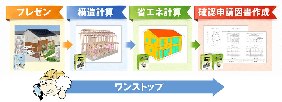 ホームズ君シリーズは、住宅の初期プレゼン → 構造計算 → 省エネ計算 → 確認申請 までを一貫して行える設計環境を提供しています。そのため、ホームズ君製品をシリーズで導入することで、業務の効率化を図っていただけます。また、多機能統合型のソフトと比較して、必要な機能だけを導入でき、初期費用だけでなく保守料も安価であるため、経済的に運用していただけます。
