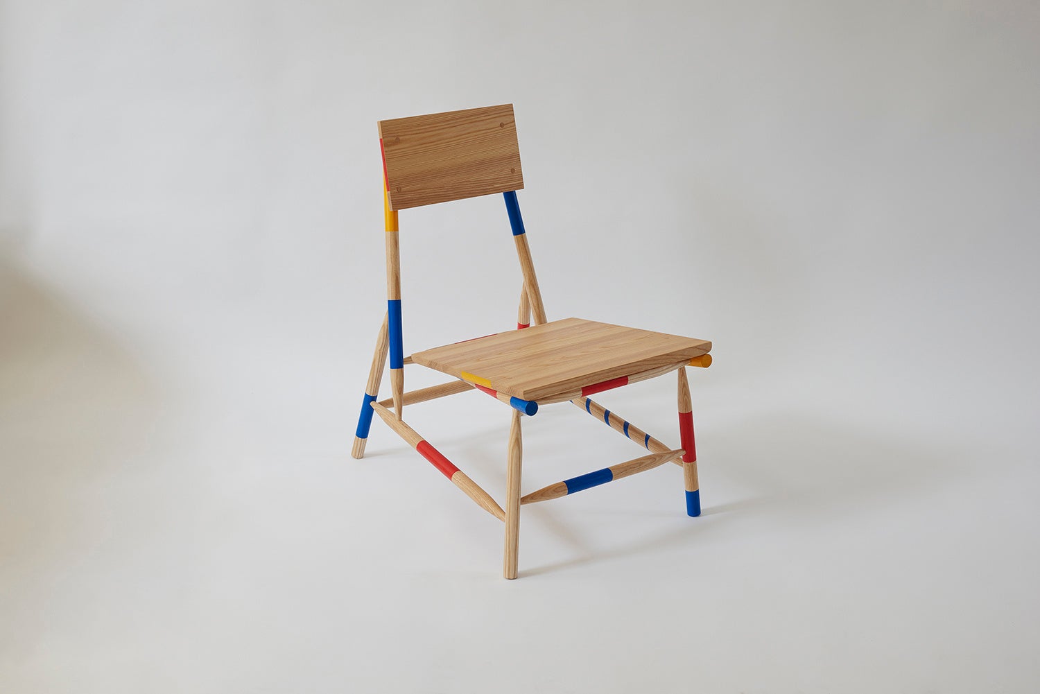 ミカドシリーズはテーブルゲーム Mikadoから着想を得た作品。細いスティック状の構造体で作られた椅子は、繊細なバランスに基づいたゲームのコンセプトを反映し、使用されるスティックを想起させるように赤、黄色、青色に塗装されている。座面はダボ継ぎの技術を使用することで緻密で、頑丈な設計。日本語でタイトルが付けられ、ヨーロッパの企業によって開発された Mikado というゲームをアイディアに取り入れることにより、東西の文化の融合を遊び心のあるスタイルで表現している。