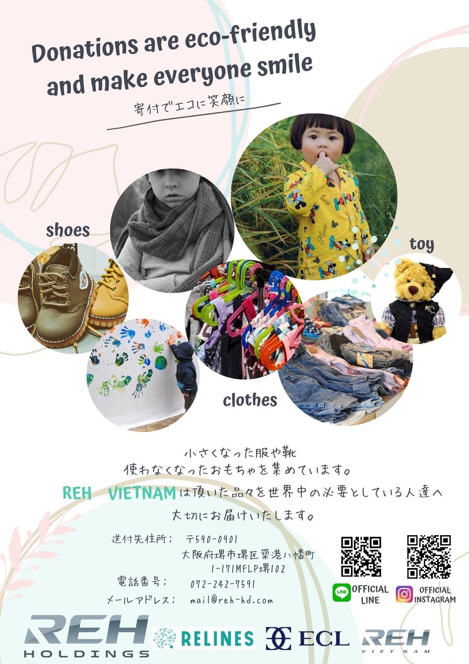 REHホールディングス株式会社、REHベトナム株式会社、RELINES株式会社、ECL株式会社の4社は、小さくなった服や靴、使わなくなったおもちゃを必要としてる人達へ大切にお届けいたします。