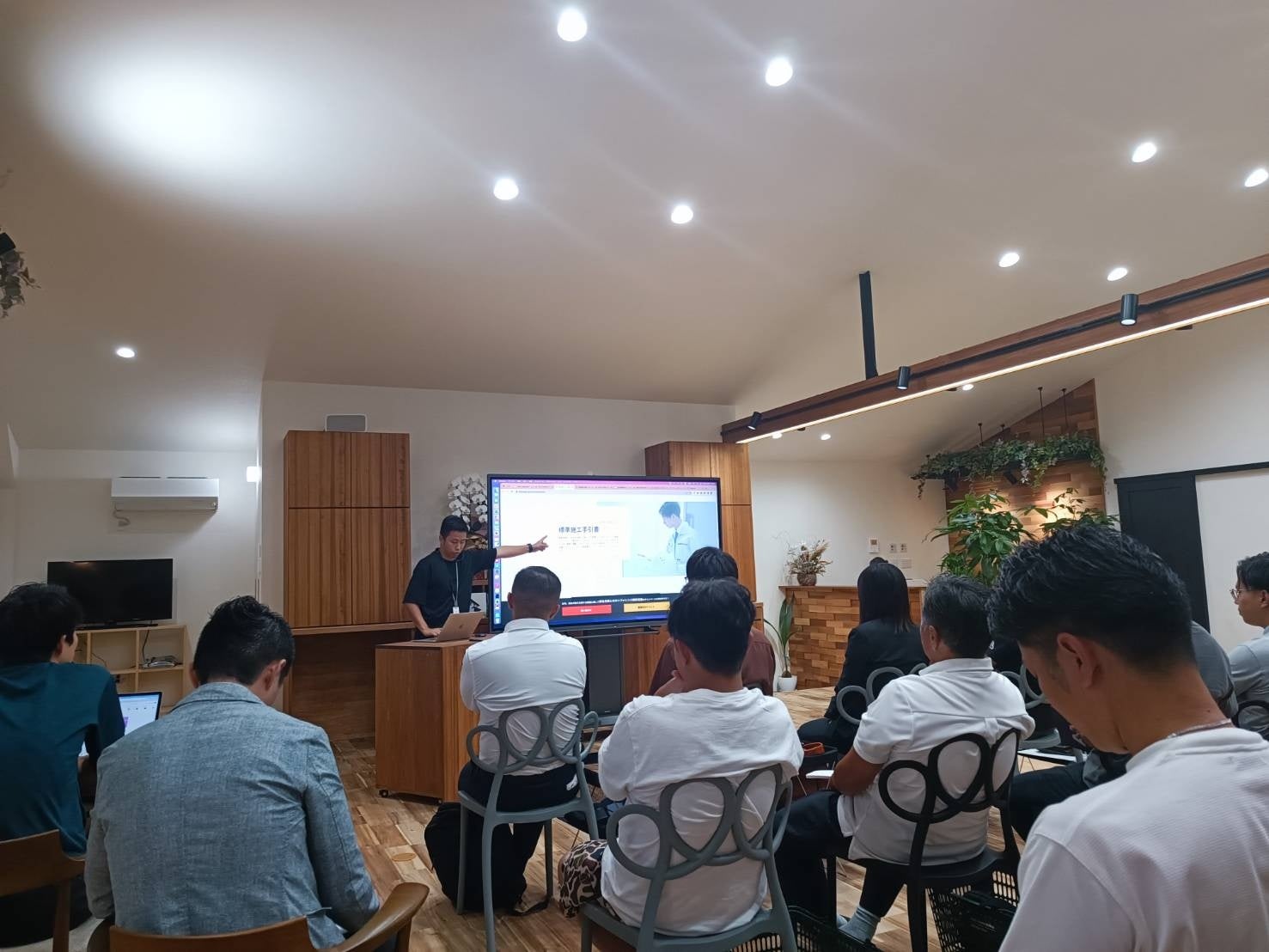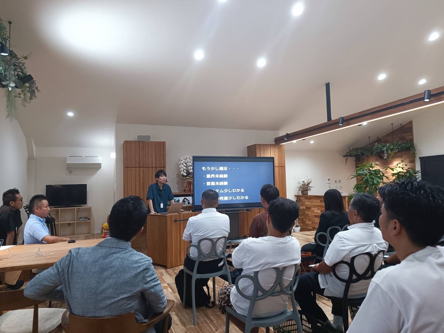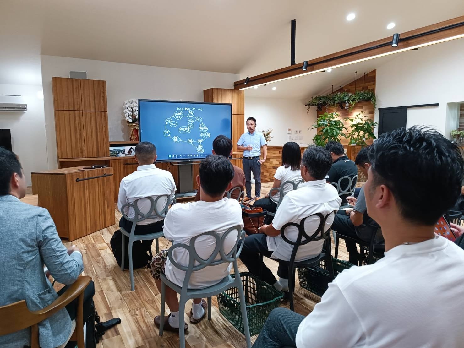 その後8月に完成した新社屋で実施した分科会では、平松明展社長が自ら実践によって培った情報発信のコツや集客効果、事業戦略などを具体的な数字を交え率直に語ったほか、現場担当や営業担当の若手社員が登壇。顧客管理をはじめとする業務のDX化や宿泊体験の提供、ライフプランの提案などが、住宅業界未経験の入社1年目から年間7棟の受注につながったといった実績や、DX化によって情報共有が進んだ施工管理の様子を披露しました。