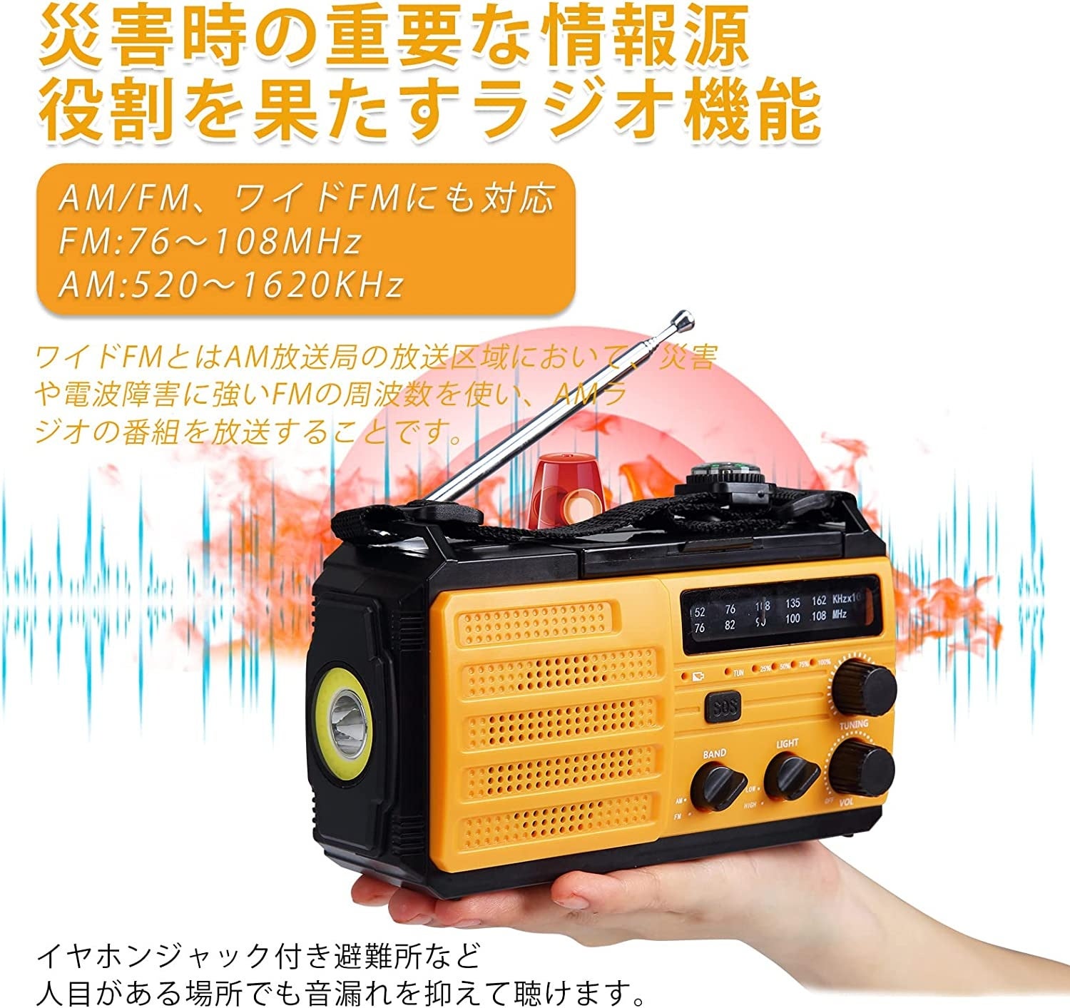 Litakeの多機能防災ラジオは、災害時に必要な明かりや電源を確保し、情報収集や緊急SOS機能を備えた頼れる防災グッズです。8000mAhの超大容量バッテリーと多様な充電方法で、長時間使用が可能。AM/FMラジオの高感度受信やワイドFM対応でクリアな音声を楽しめます。さらにSOSアラートや高輝度LED懐中電灯も装備し、緊急時の安全をサポート。防水設計や品質保証もあり、安心してご利用いただけます。災害時やアウトドア活動に必須のLitake防災ラジオで、備えと安心を手に入れましょう!