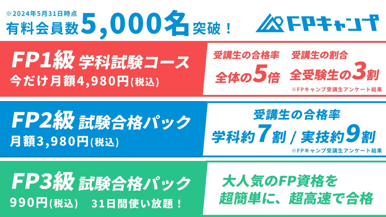 FPキャンプは本質を理解する学びの楽しさを感じながら、最短合格に向けて効率的に学習できるサブスク型オンラインFP資格スクール。2023年7月にFP1級学科試験コース、同年12月にFP2級コース、2024年4月に3級コースを開講。昨年7月の開講から11か月間で全コースの有料受講者数が累計で5,000名を突破しました(内訳:1級学科試験コース2,300名超、2級コース2,500名超、3級コース200名超)。