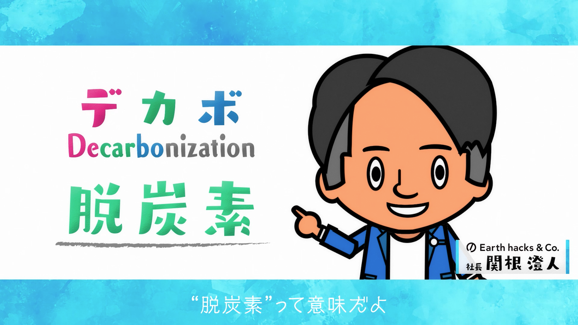 『海の森を守ろう!日本列島 ブルーカーボンプロジェクト』を推進していくPRキャラクターとして新たにそらジローファミリーに加わり『ウミコイ -今 海に出来ること-』にも出演している「うみスケ」はデカボがわからず「デカボ?メタボ?」と悩みます。そこへEarth hacks株式会社の代表取締役社長の関根澄人がキャラクターとなって登場し、生活者の脱炭素アクションのきっかけとなる「デカボスコア」について「うみスケ」に紹介していきます。