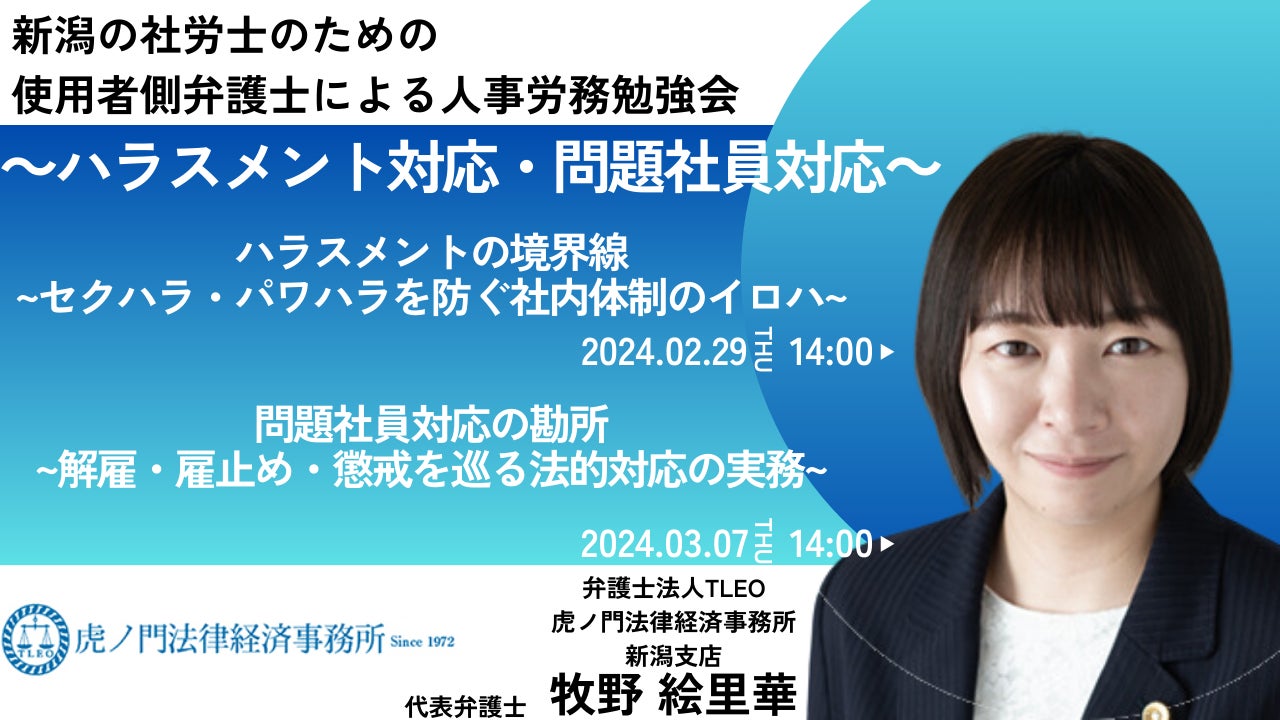 今回、弁護士法人TLEO虎ノ門法律経済事務所新潟支店は、新潟地域で労務顧問業務に従事する社労士の皆さまに向け勉強会を開催いたします。