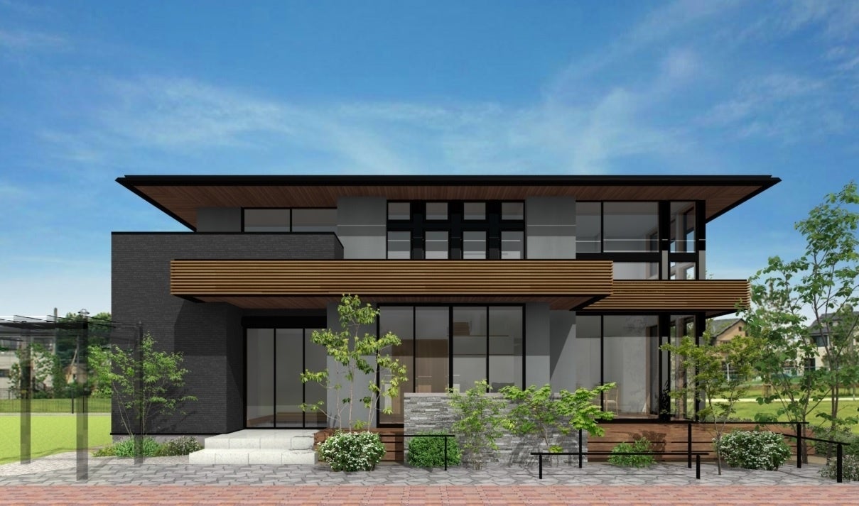 コーナー部分の大きな窓が印象的で洗練された外観。水平を強調するコートラインや木調の深い軒が、住まいに風格を与えます。
